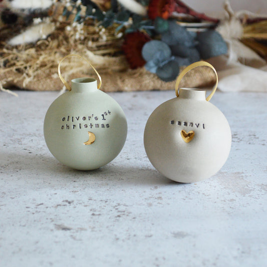 PRE-ORDER PERSONALISED Small Pastel Bauble With A Gold Heart | Stoneware | Hanging Christmas Decorations | Christmas Tree Decor