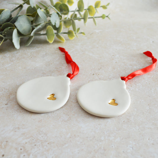 Seconds* A PAIR of Flat Bauble Hanging Decoration With A Gold Heart | Porcelain | Hanging Christmas Decorations | Christmas Tree Decor (A93-2)