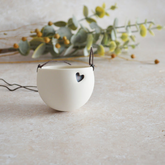 Discontinued* Small Hanging Planter with a Oxide Embossed Heart and Brown String for Hanging | Porcelain | Hanging Planter (B30)