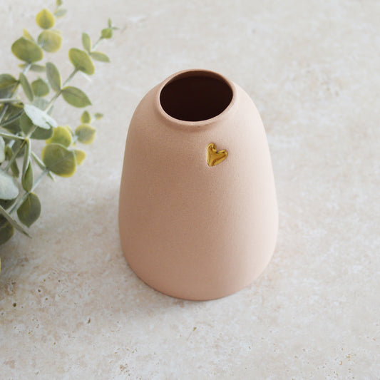 Seconds* Discontinued* Pastel Brown Ceramic Vase With A Short Rim And An Embossed Gold Heart | Flower Vase | Home Decor | Gifts For Her | Stoneware (A62)