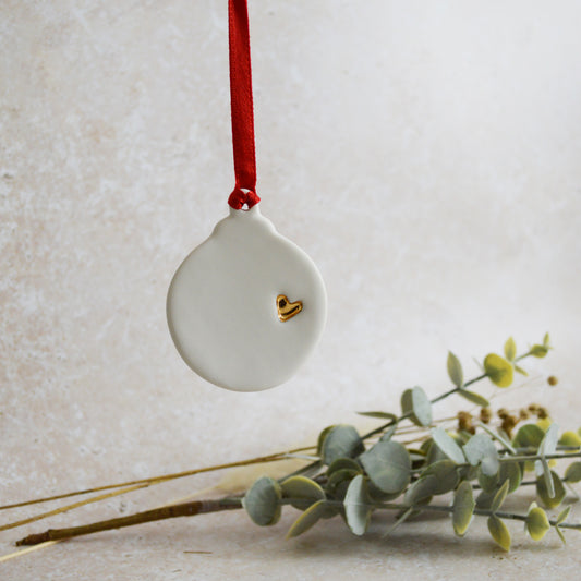 Seconds* A PAIR of Flat Bauble Hanging Decoration With A Gold Heart | Porcelain | Hanging Christmas Decorations | Christmas Tree Decor (A93)