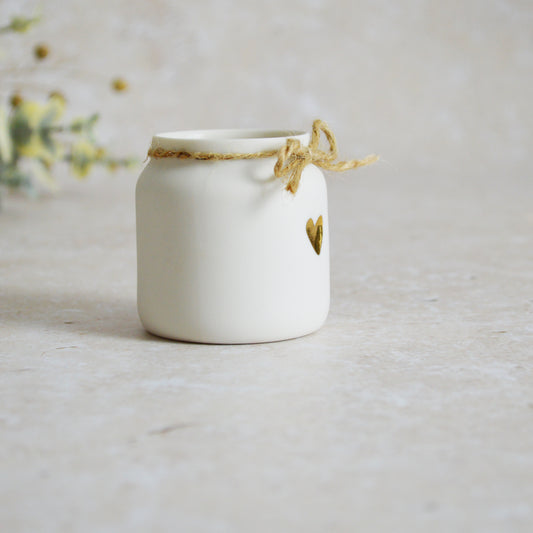 Discontinued* Small White Jar with Gold Embossed Heart and Twine | Porcelain Jar (B29)