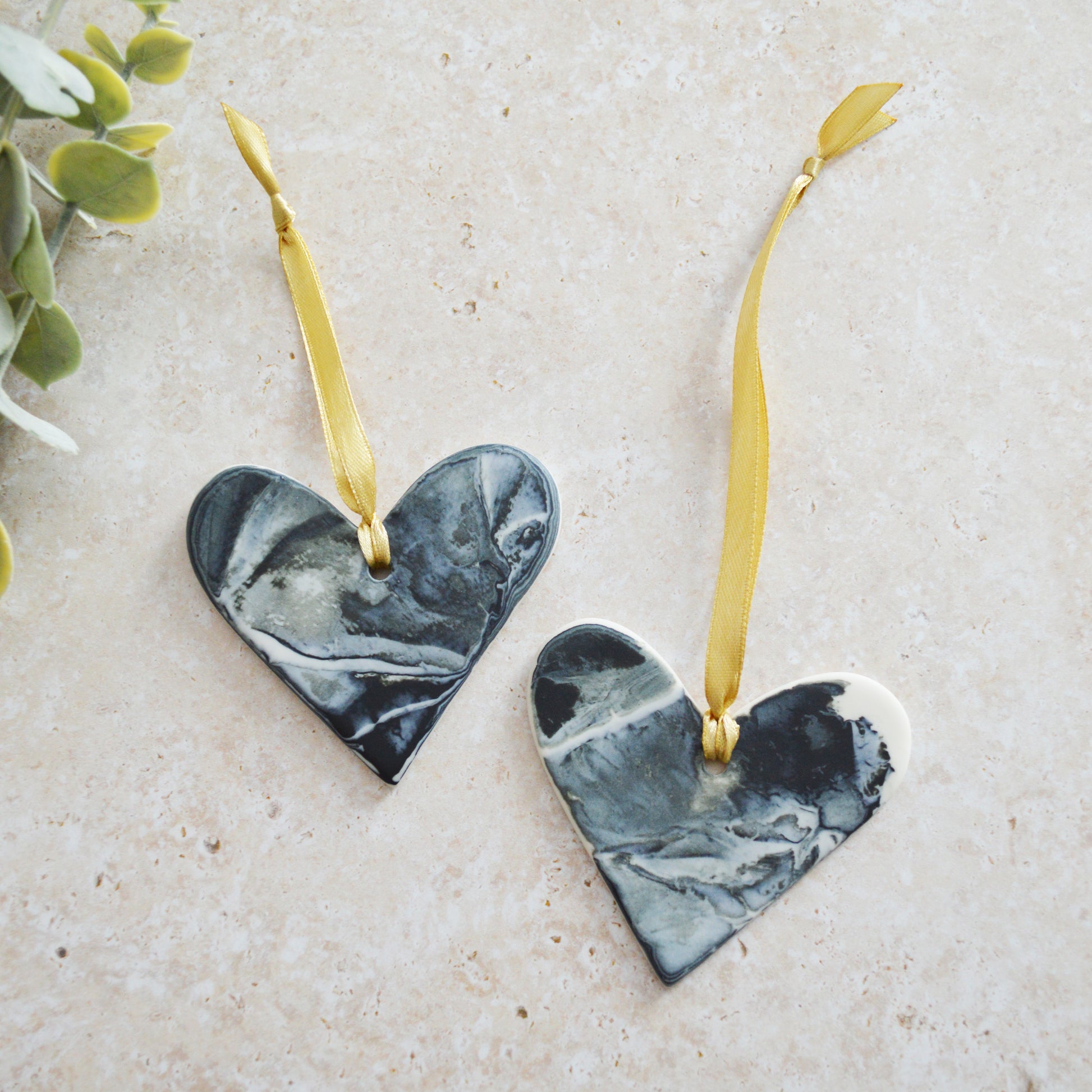 Sample* A PAIR of Delicate Black and White Marbled Heart with a White Back| Porcelain | Hanging Heart Decoration | Valentines Keepsake (A95)