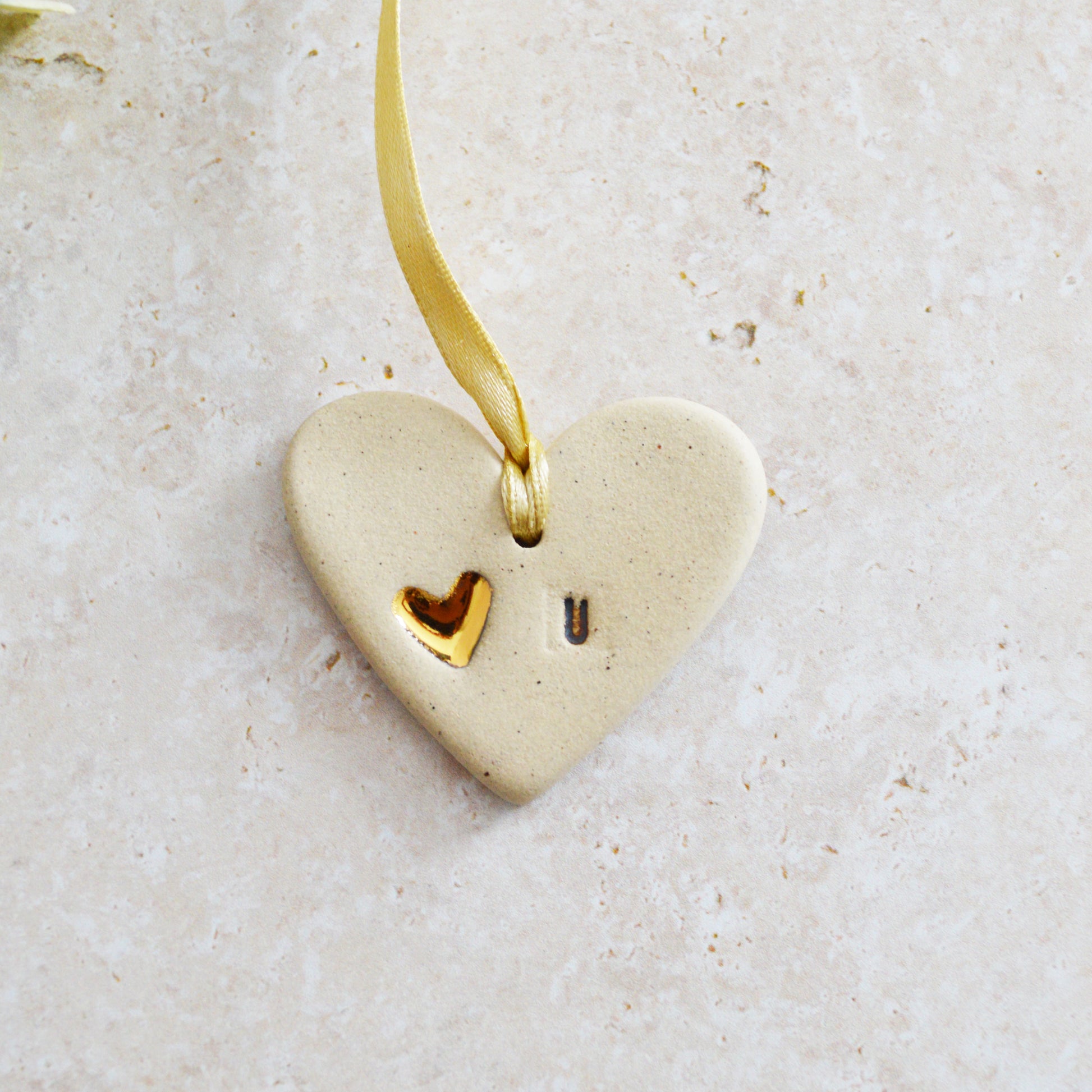 Lovingly handmade each heart has gone through at least nine stages before being packed up and sent to it's new home. The small gold heart U tag is embossed with a hand painted gold heart and the letter U stained. Once it's gone through all of it's previous stages it is then hand polished for a soft matte finish.