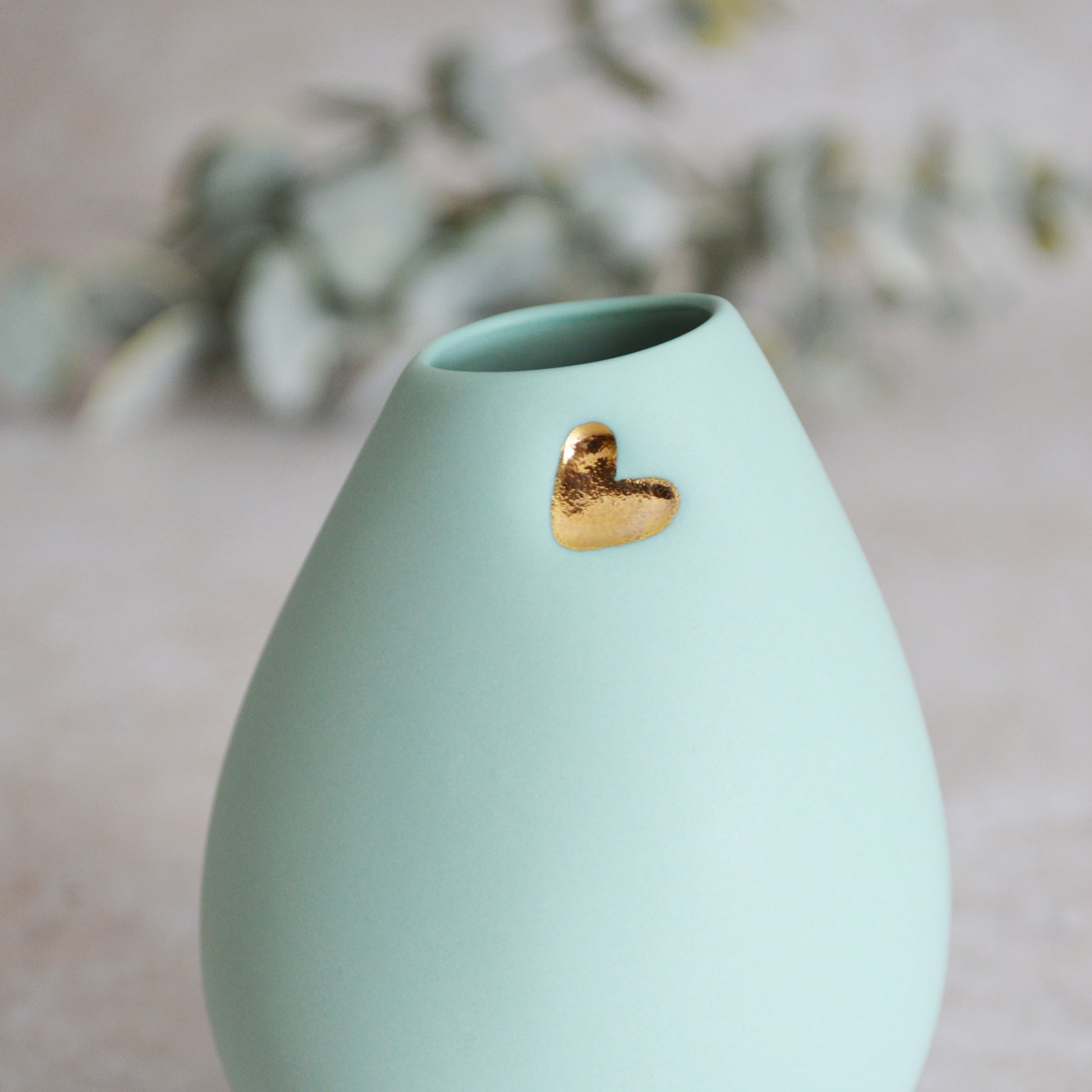 Seconds* Pastel Mint Bud Vase With An Embossed Gold Heart | Spring Vase | Mother's Day Gifts | Porcelain (A17)