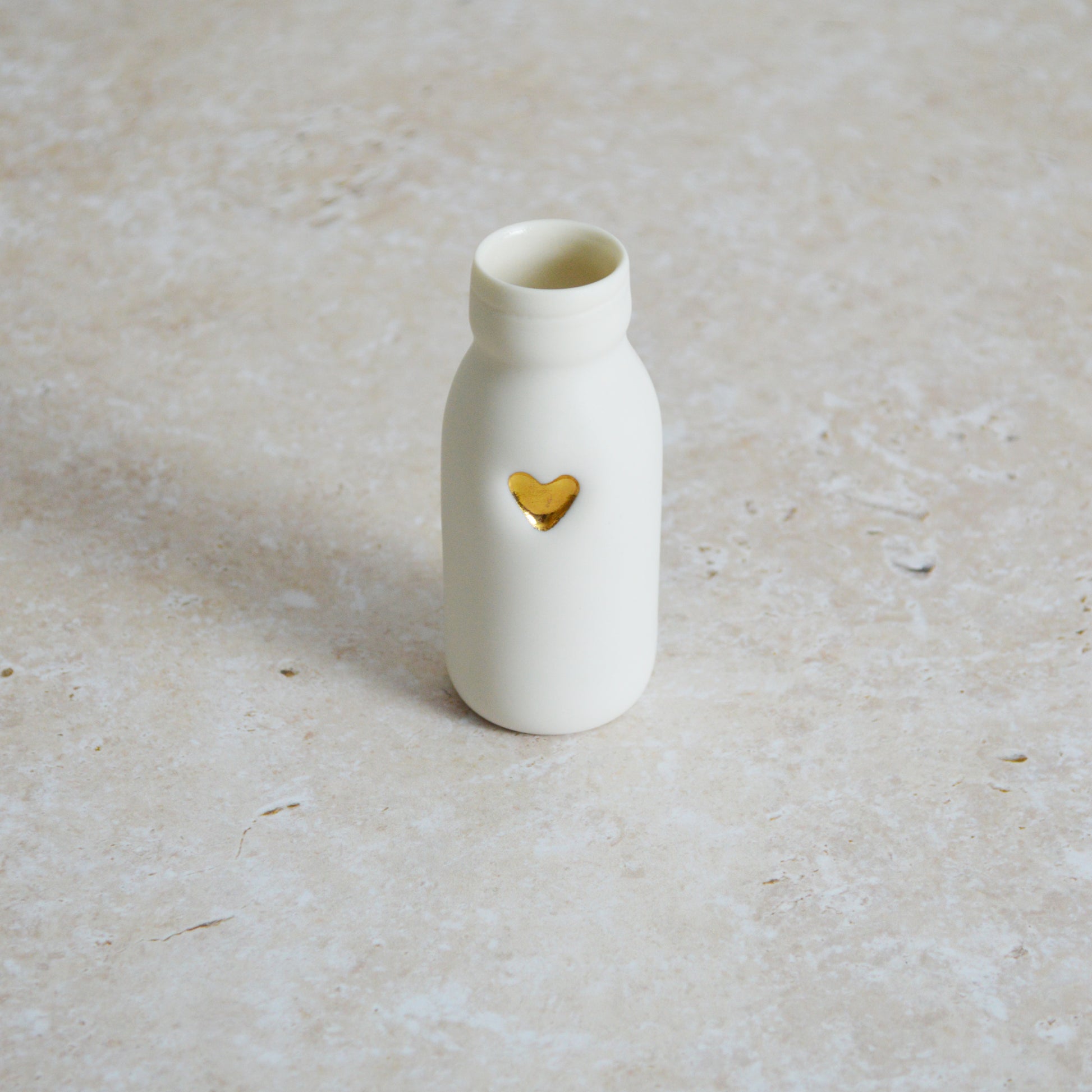 Every bottle is handcrafted from porcelain. Lovingly made, each bottle goes through a minimum of nine stages. From casting to fettling, to hand painting the gold heart, each stage just as important as the last. Once it's reached it's penultimate stage, it's then carefully hand polished for a smooth, matte, silky feel. Every bottle is glazed on the inside so it can hold water for fresh flowers.