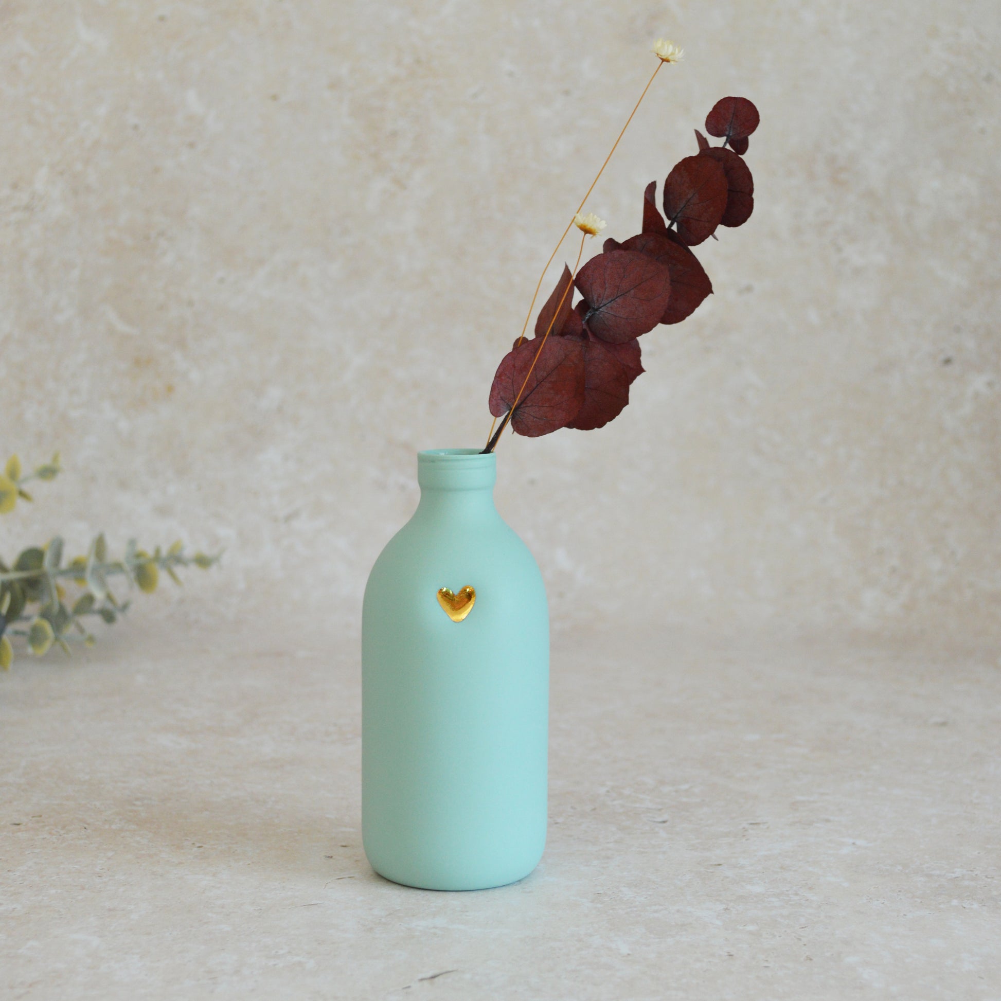 Whether you're looking for a unique special gift or treating yourself, this handmade bottle vase is a great addition to any room. Standing alone or in a group it's sure to brighten up any space. The gold embossed and hand painted heart brings a little magic to a very simple piece.