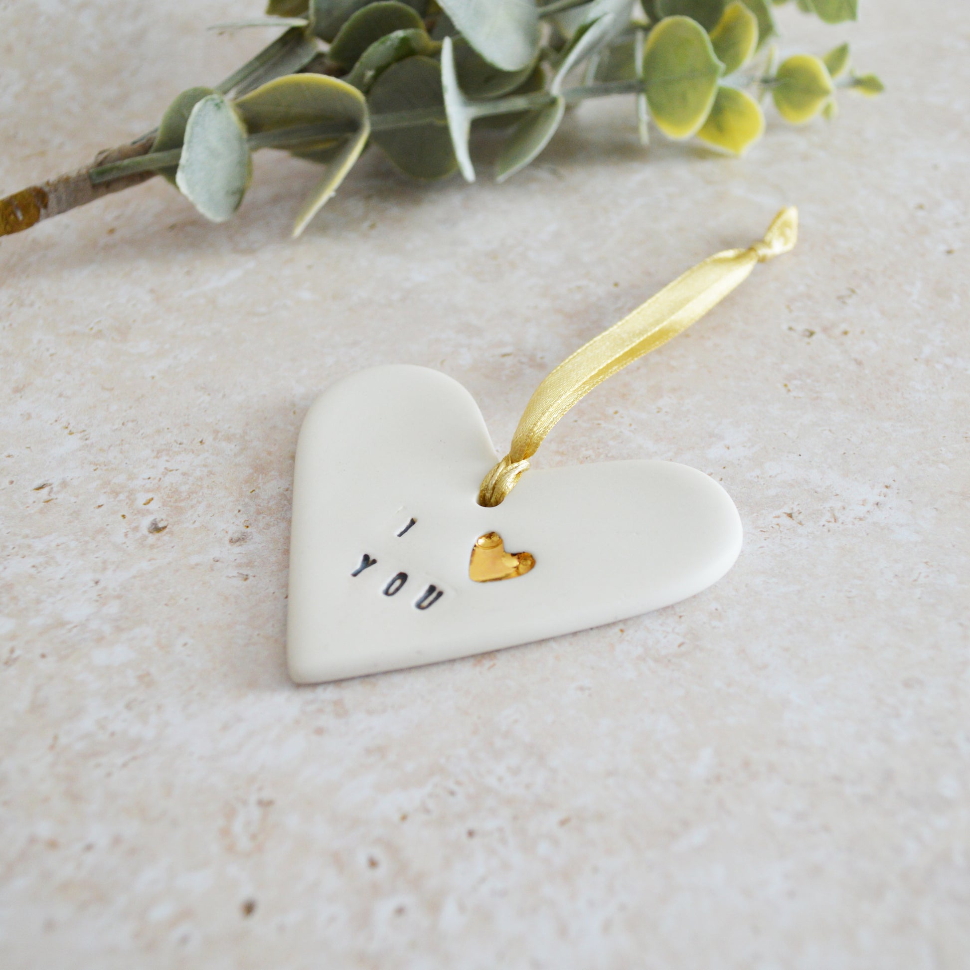 Seconds* I Love You Heart With A Gold Heart | Porcelain | Hanging Heart Decoration | Valentines Keepsake (B80)