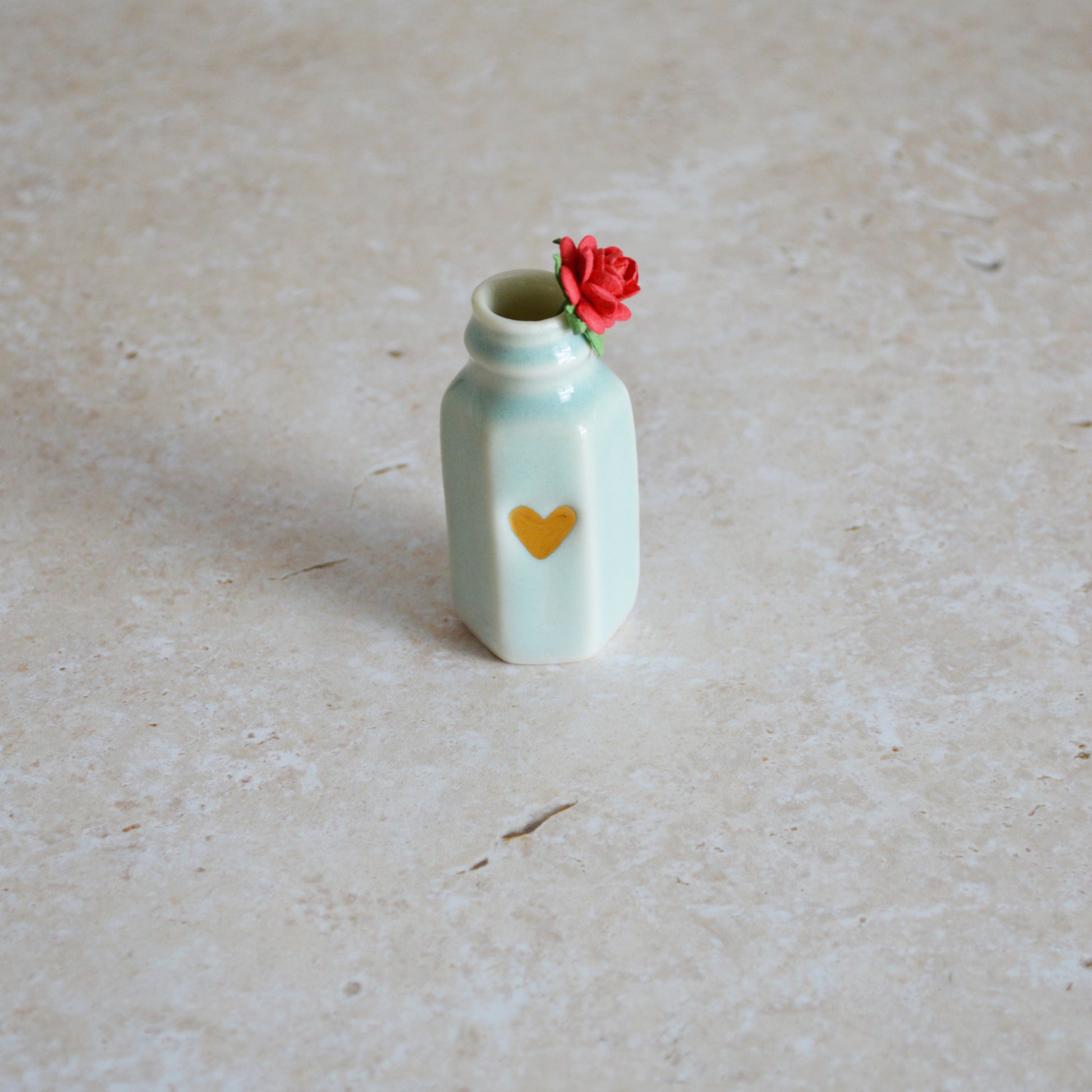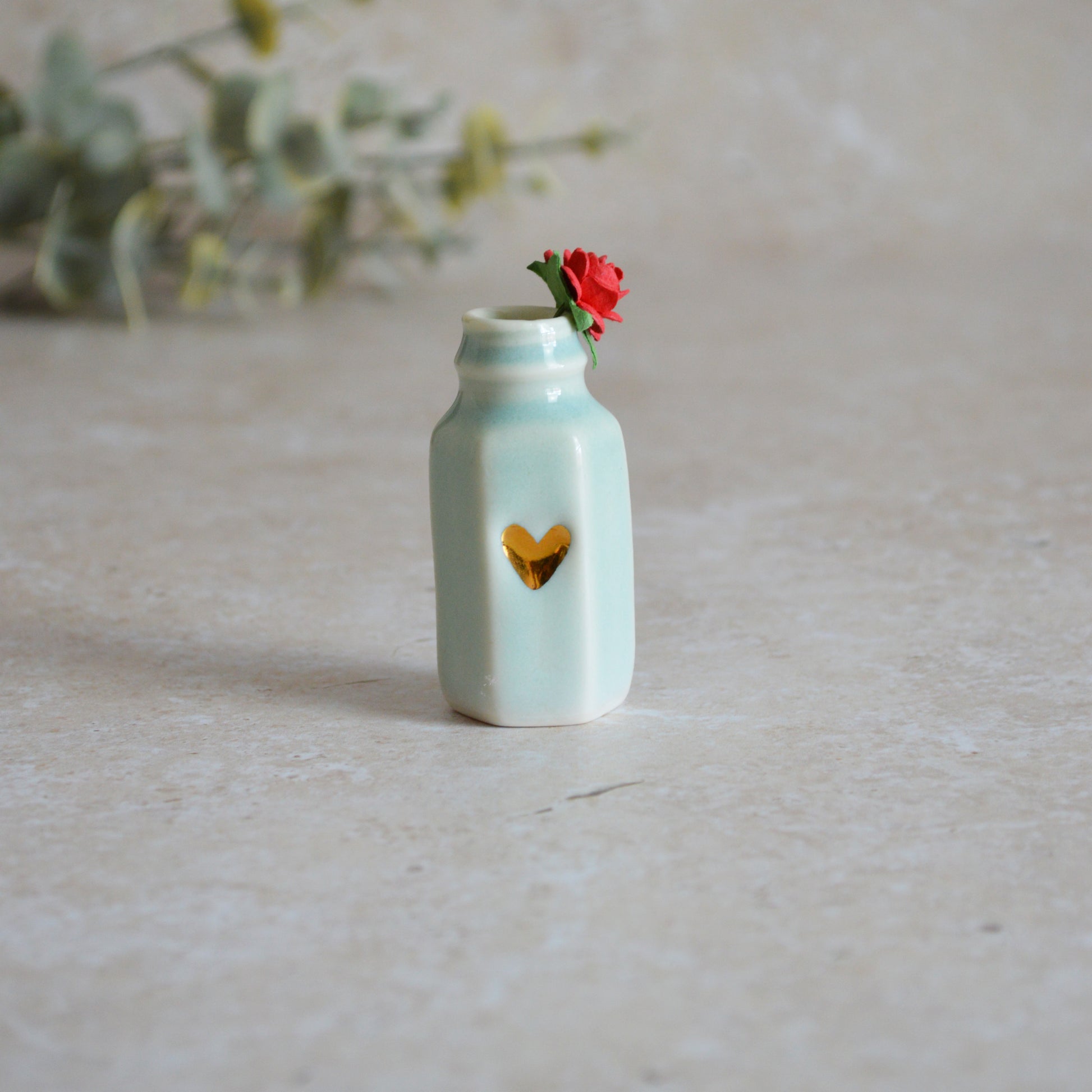 The bottle back is engraved with lines on the back three faces and the front three are plain. The heart has been hand painted with gold lustre. As the bottle has been stamped with the heart it pushes the sharp edges out giving the edges a slight quirky curve which can be seen in the images above. This bottle will come with a red wire stem rose.