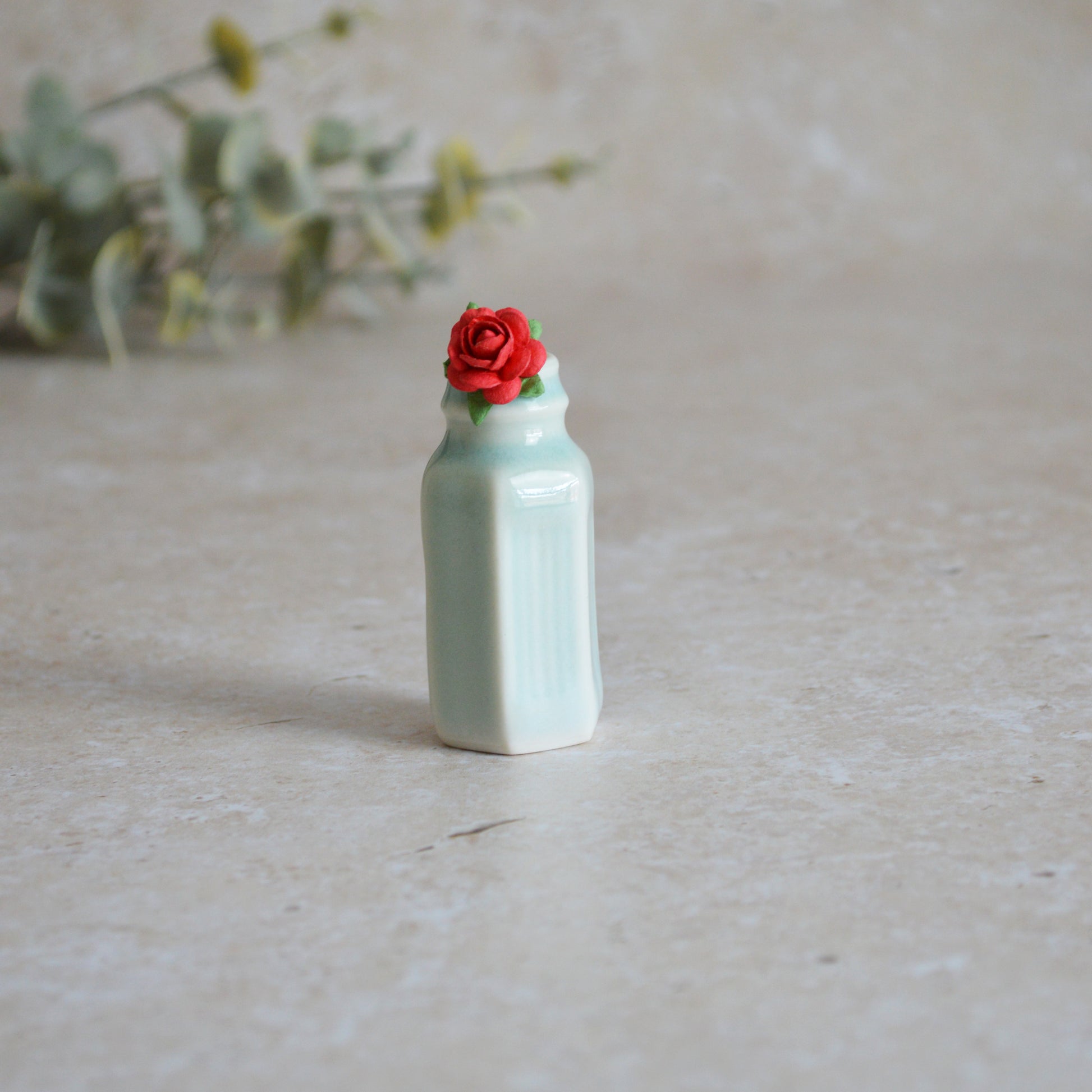 Seconds* Discontinued* Small Glazed Bottle with an Embossed Gold Heart and a Paper Red Rose (A20)