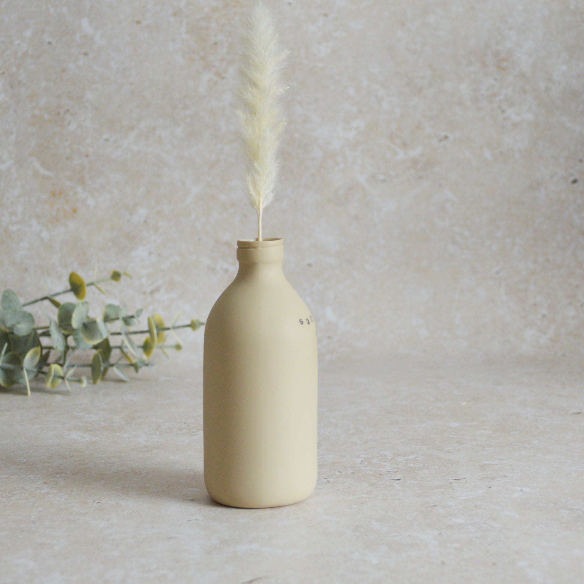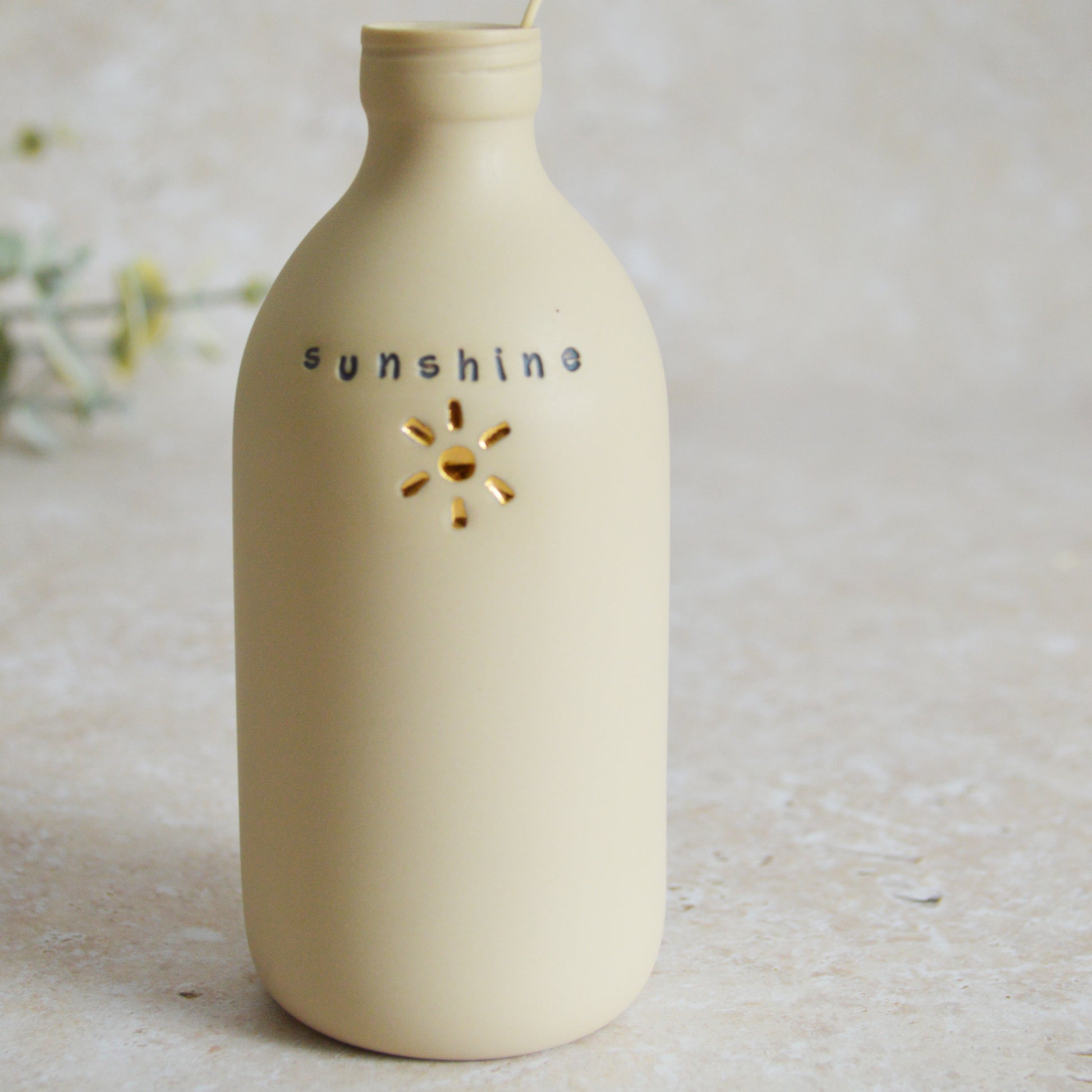 This beige bottle is handmade from stained porcelain and hand polished for a smooth matte finish giving it a very soft feel. Each bottle is taken through at least nine stages, from casting, to fettling, firing and to polished twice, every step is just as important as the last. Each letter is individually stamped and filled with colour. Each sun is hand stamped and then hand painted, making it the sweetest gift for birthdays, anniversaries and mother's day. The bottles are glazed on the inside to hold water.