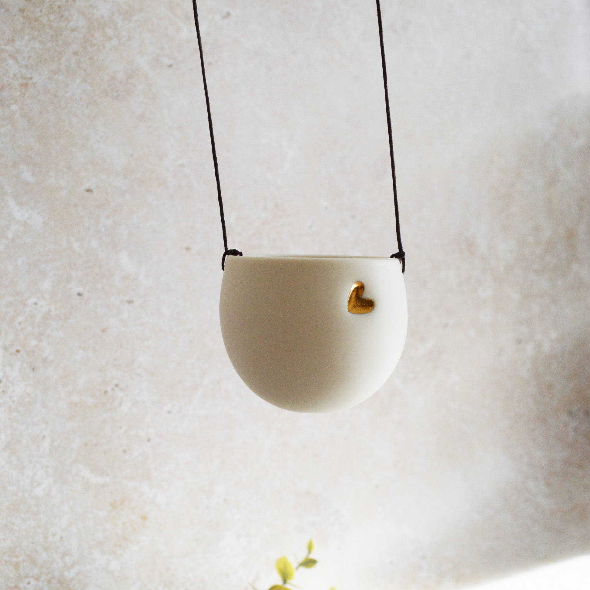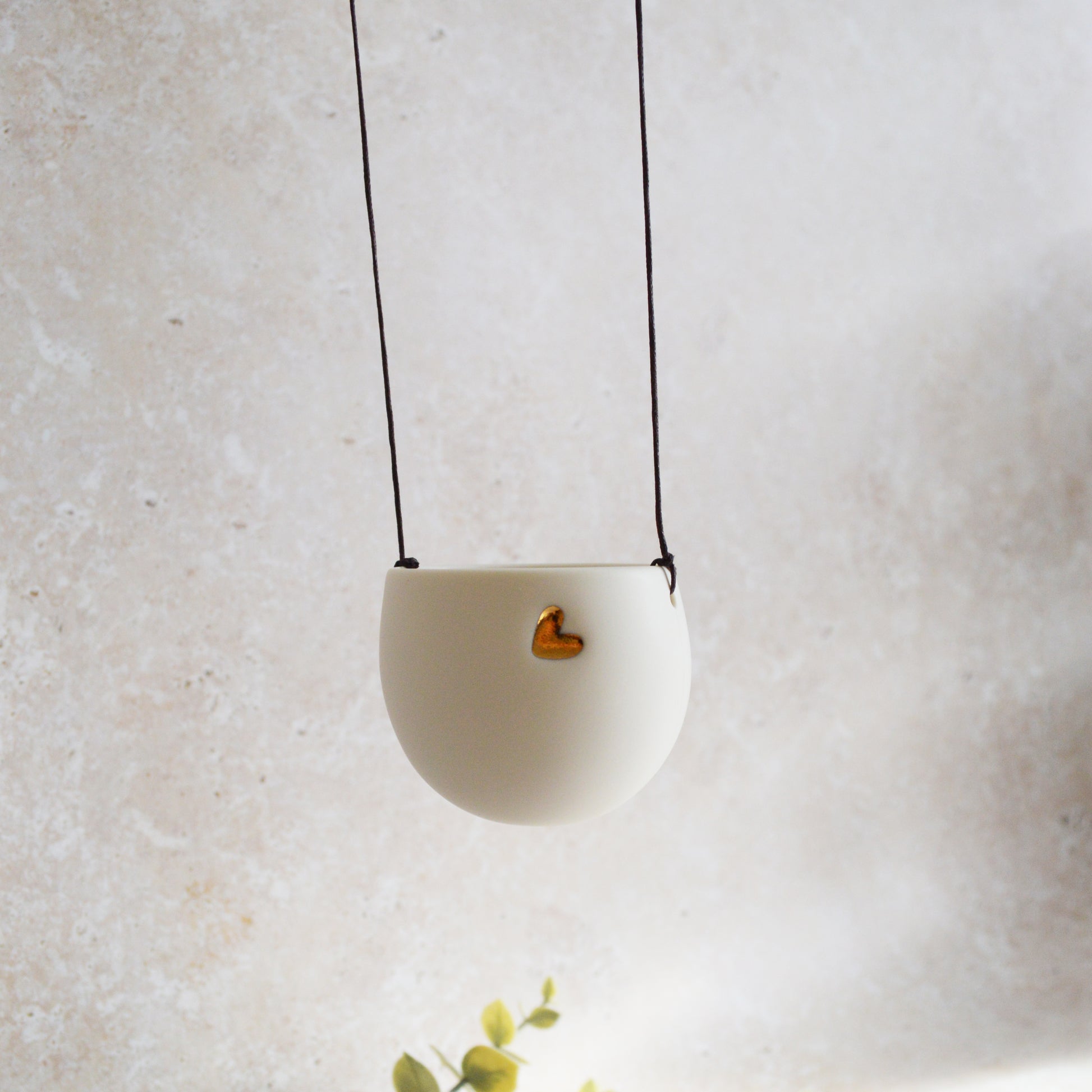 Discontinued* Small Hanging Planter with a Gold Embossed Heart and Brown String for Hanging | Porcelain | Hanging Planter (B27)