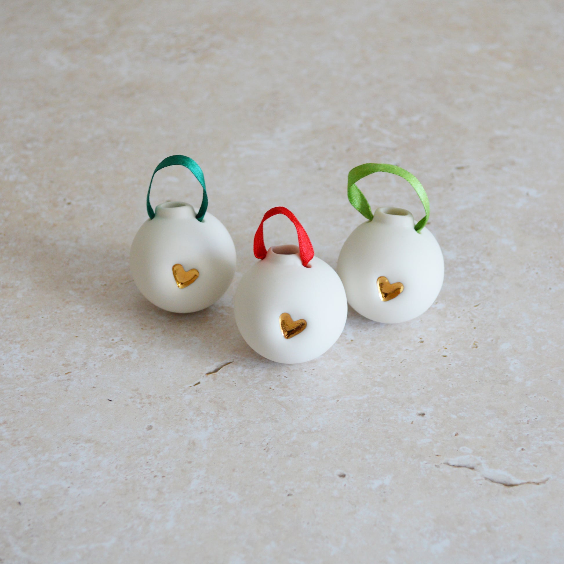 This listing is for a set of THREE porcelain baubles with red, teal and green ribbon colours. (Ribbon colour may vary due to lighting and devices)
