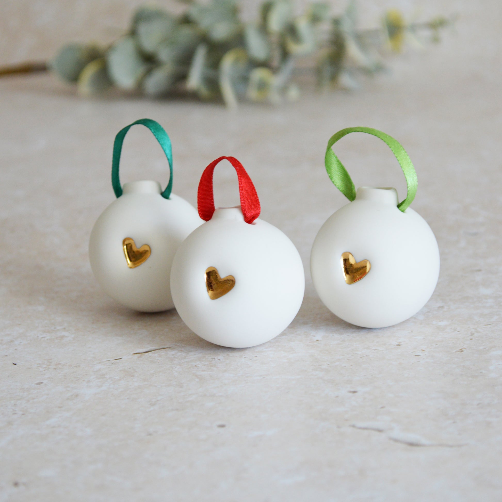 Seconds* Discontinued* Set of Three Porcelain Christmas Bauble With A Gold Embossed Heart | Christmas Decoration | Christmas Tree Decoration (B52)