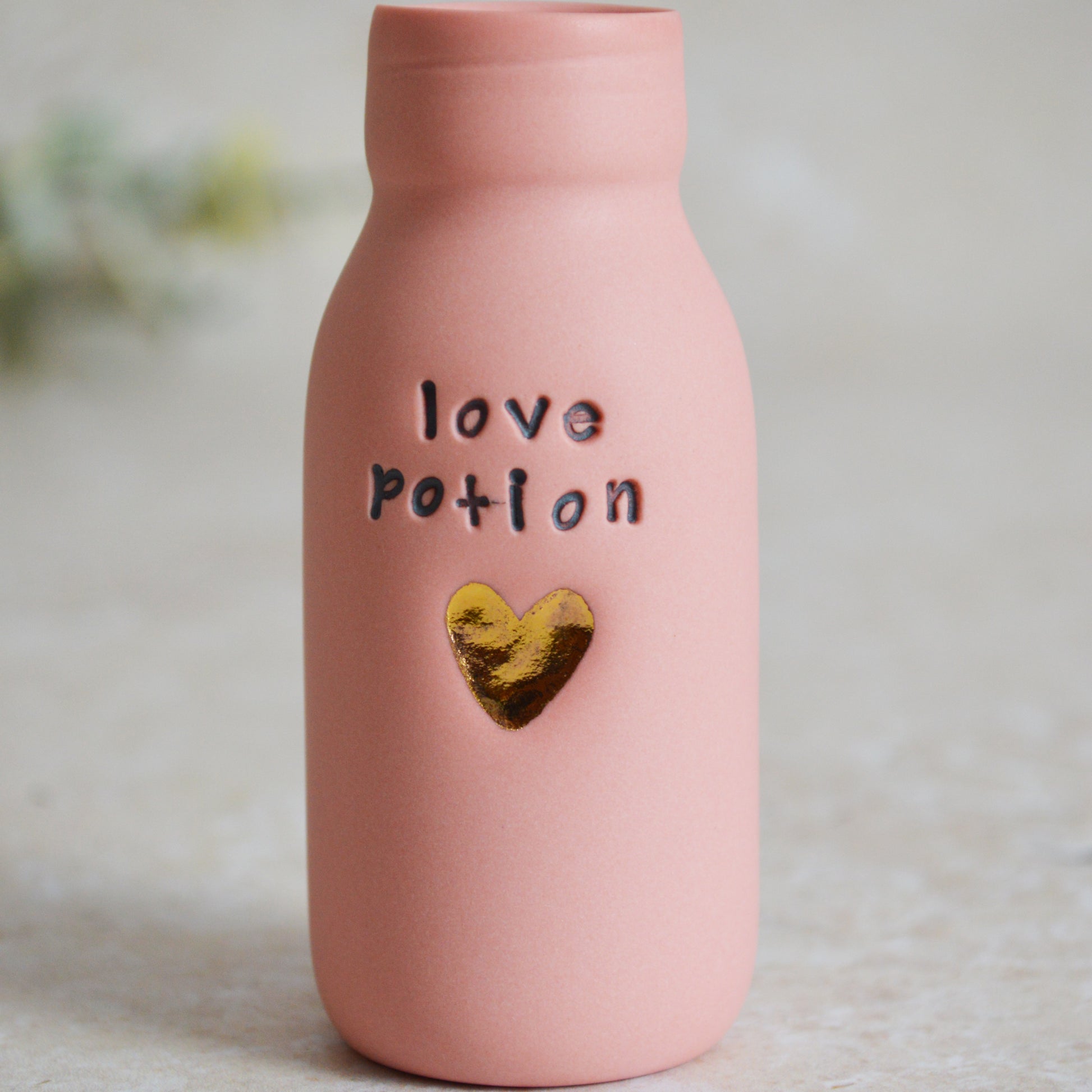 Seconds* Discontinued* Love Potion Bottle Vase With A Gold Embossed Heart | Ceramic Pink Bottle Vase| Valentine's Gift | Porcelain Vase (A8)