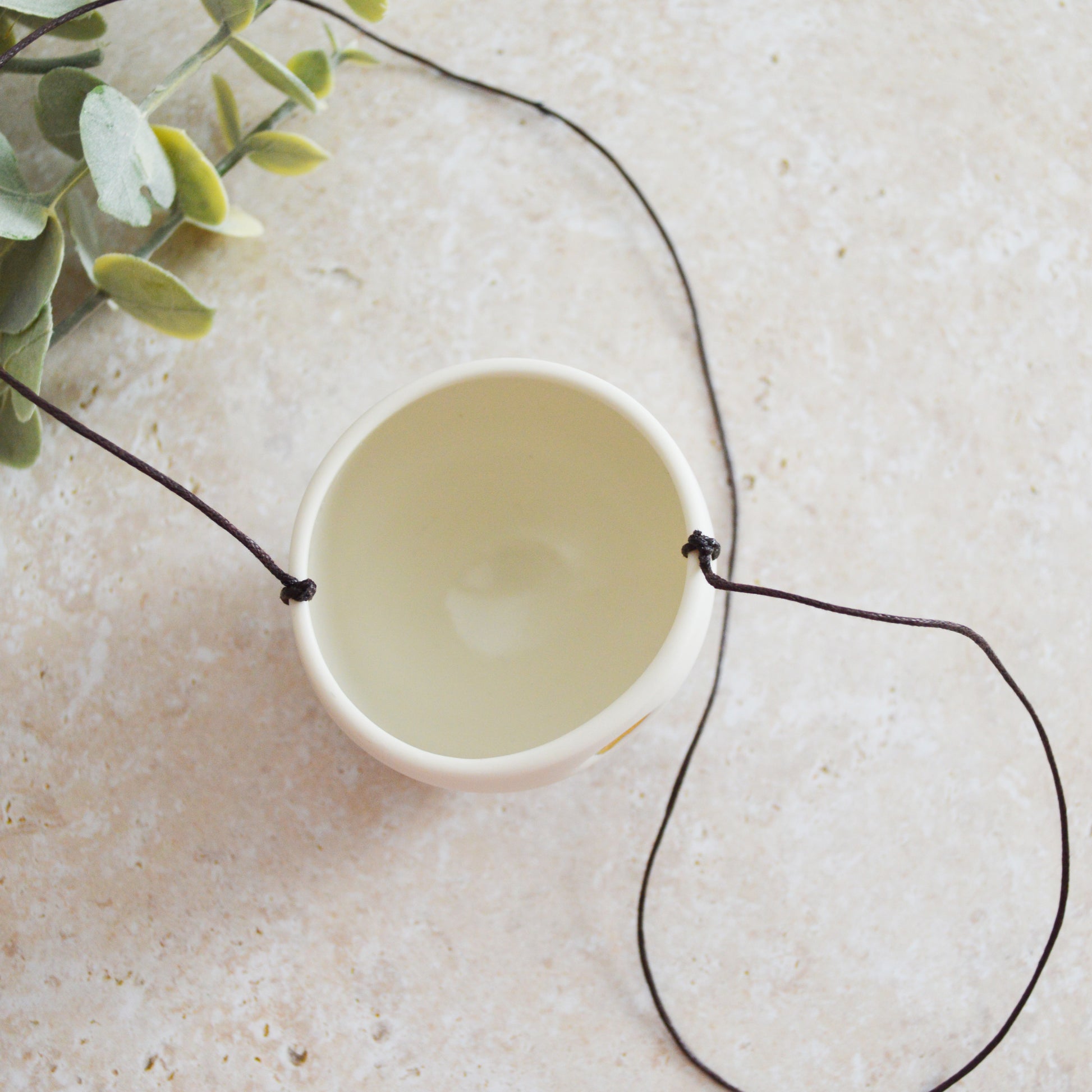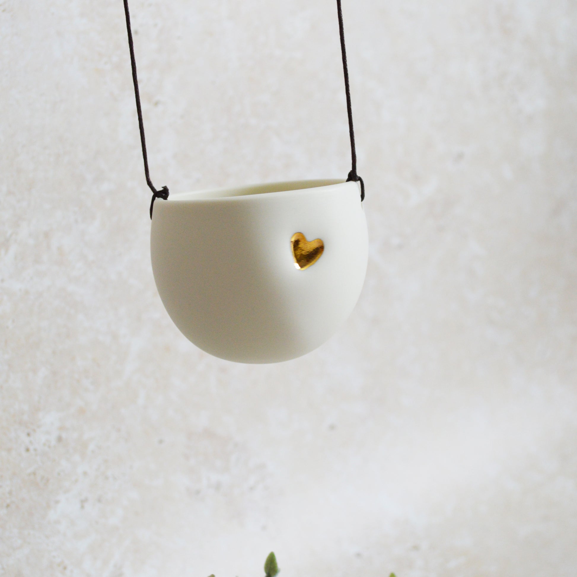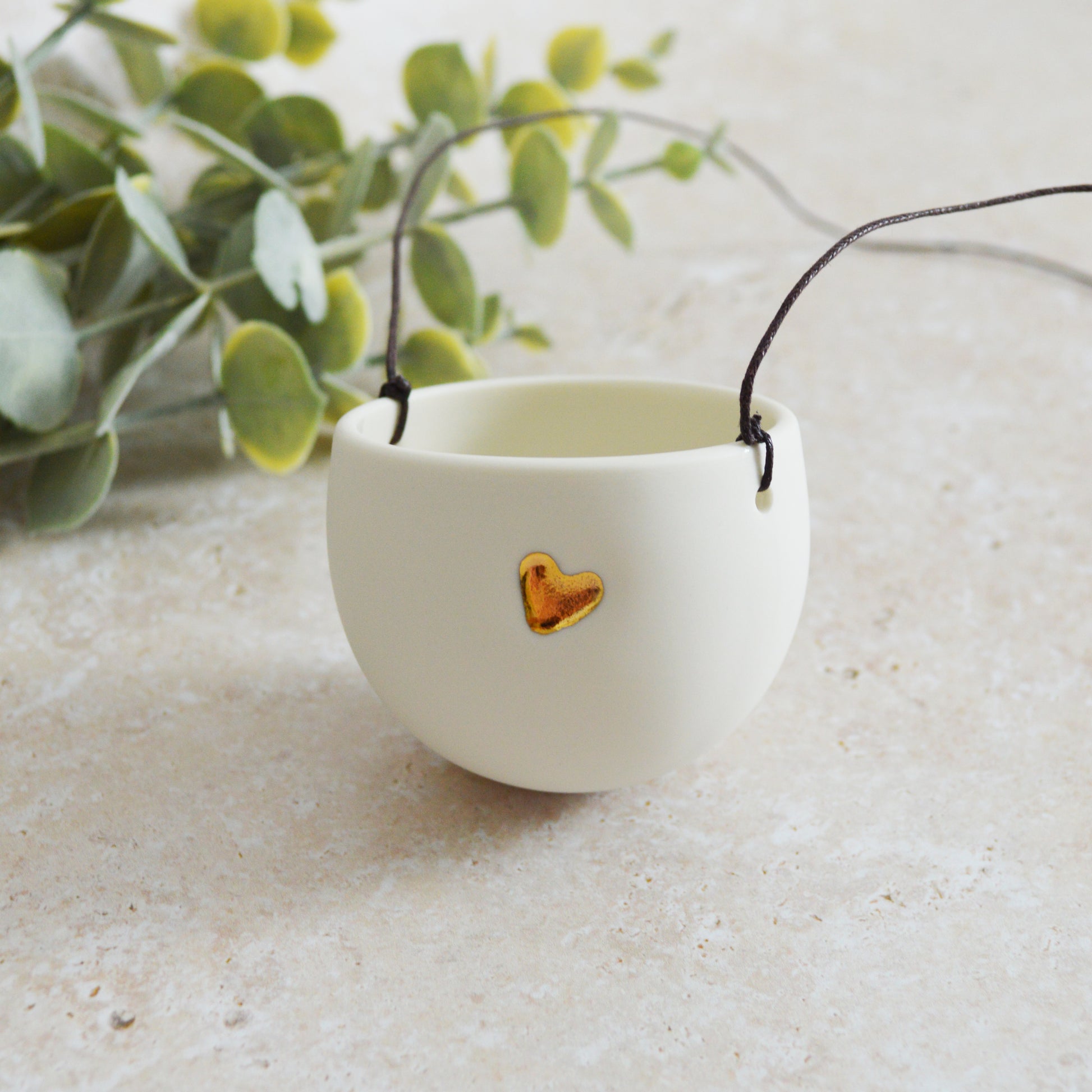 Seconds* Discontinued* Small Hanging Planter with a Gold Embossed Heart and Brown String for Hanging | Porcelain | Hanging Planter (B49)