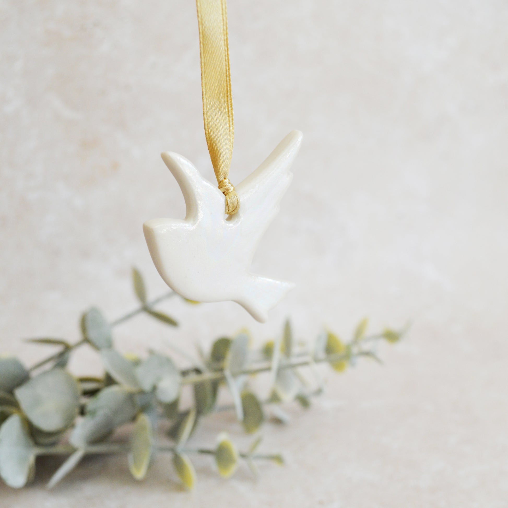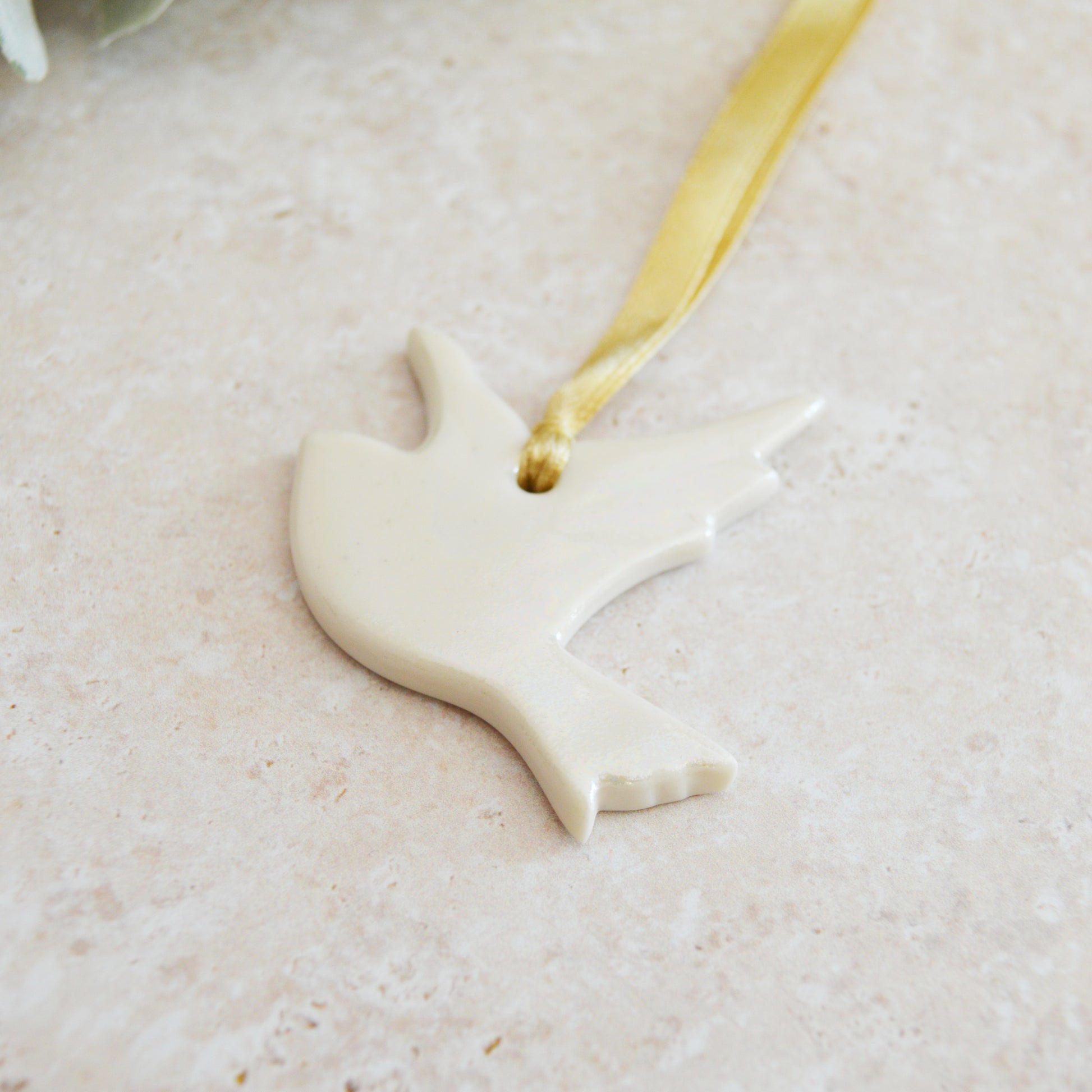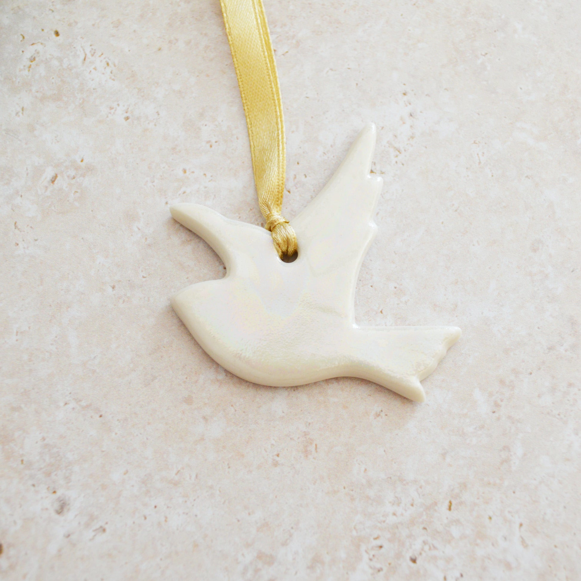 Handmade from porcelain, this little tag and has gone through at least 9 stages before being packed and sent off to it's new home. Each dove is cut, dried and every edge, no matter how small, is carefully wiped down for a clean crisp finish. It's hand painted with lustre which once fired, leaves a subtle pearl finish which shimmers when the light hits it at certain angles. The back of the tag is white. Once the dove has reached it's final step, it's hand polished for a smooth matte finish and gold ribbon is attached and sealed ready for hanging.
