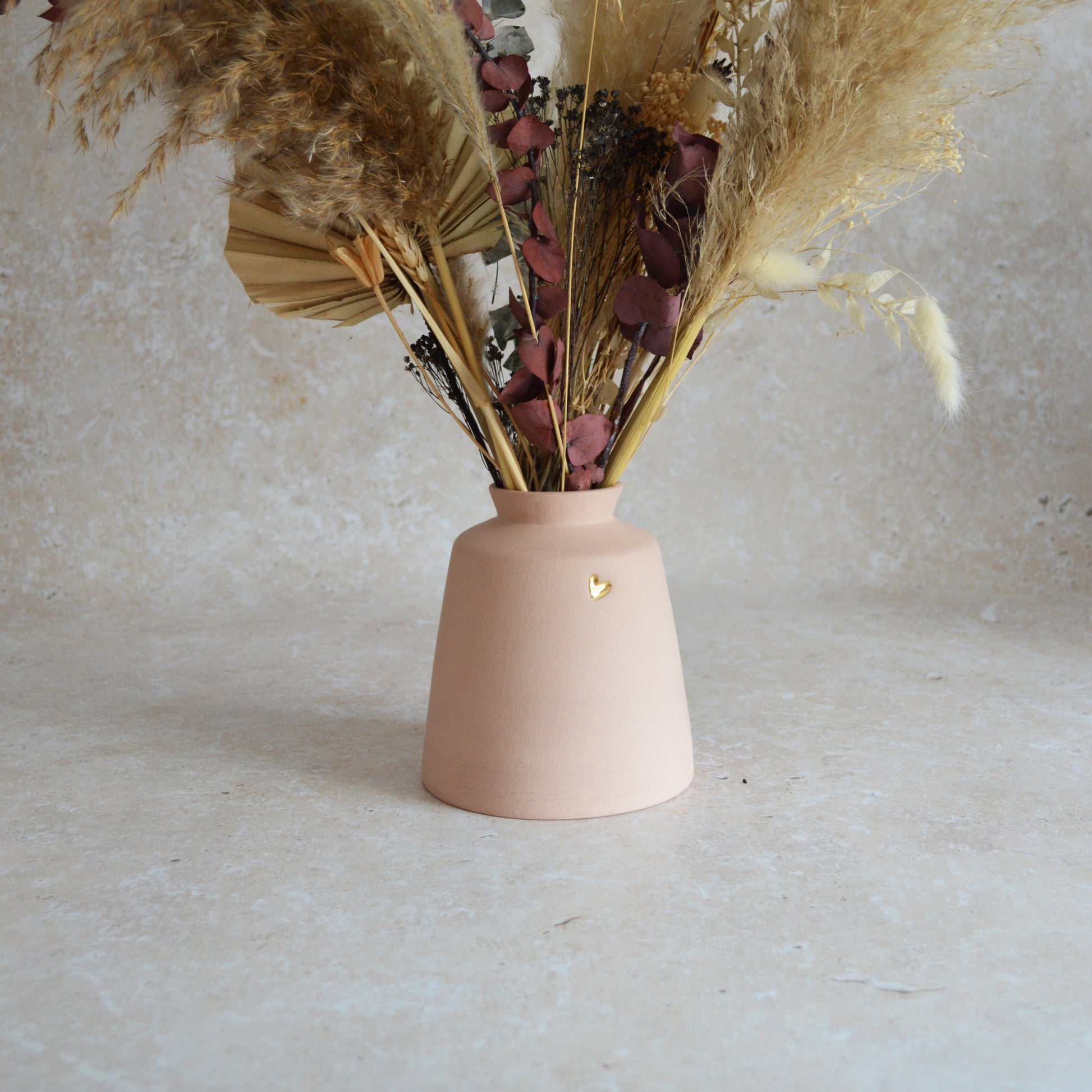 This pastel pink collard vase is one of the newest additions to the Sejal Ceramics range. The gold embossed heart, which is hand stamped and painted, makes it perfect a perfect gift for her on Mother's day, Anniversaries, Valentines and Birthdays, to name a few occasions! Paired with dried or fresh flowers they make the perfect duo.