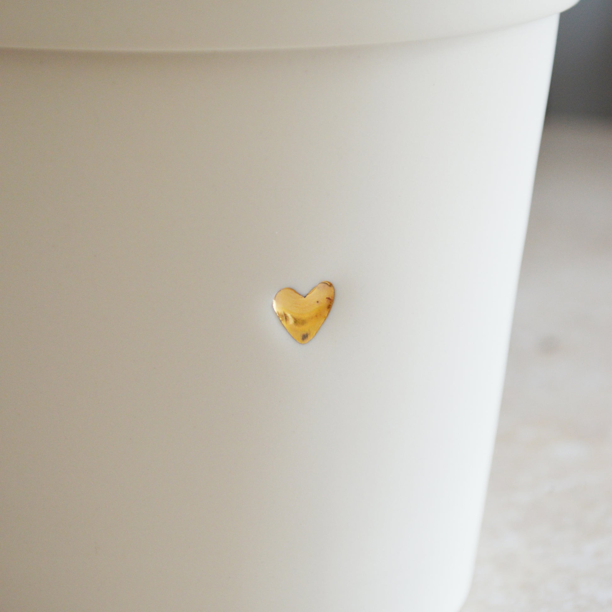 This flower pot is made from porcelain and embossed with our very own heart stamp. The heart is hand painted in gold lustre. Once the pot has gone through it's 9 stages of making, it is then hand polished for a smooth matte feel. It is finished matte on the outside and clear glazed on the inside making the pot water resistant on the inside. This pot does NOT have drainage holes.
