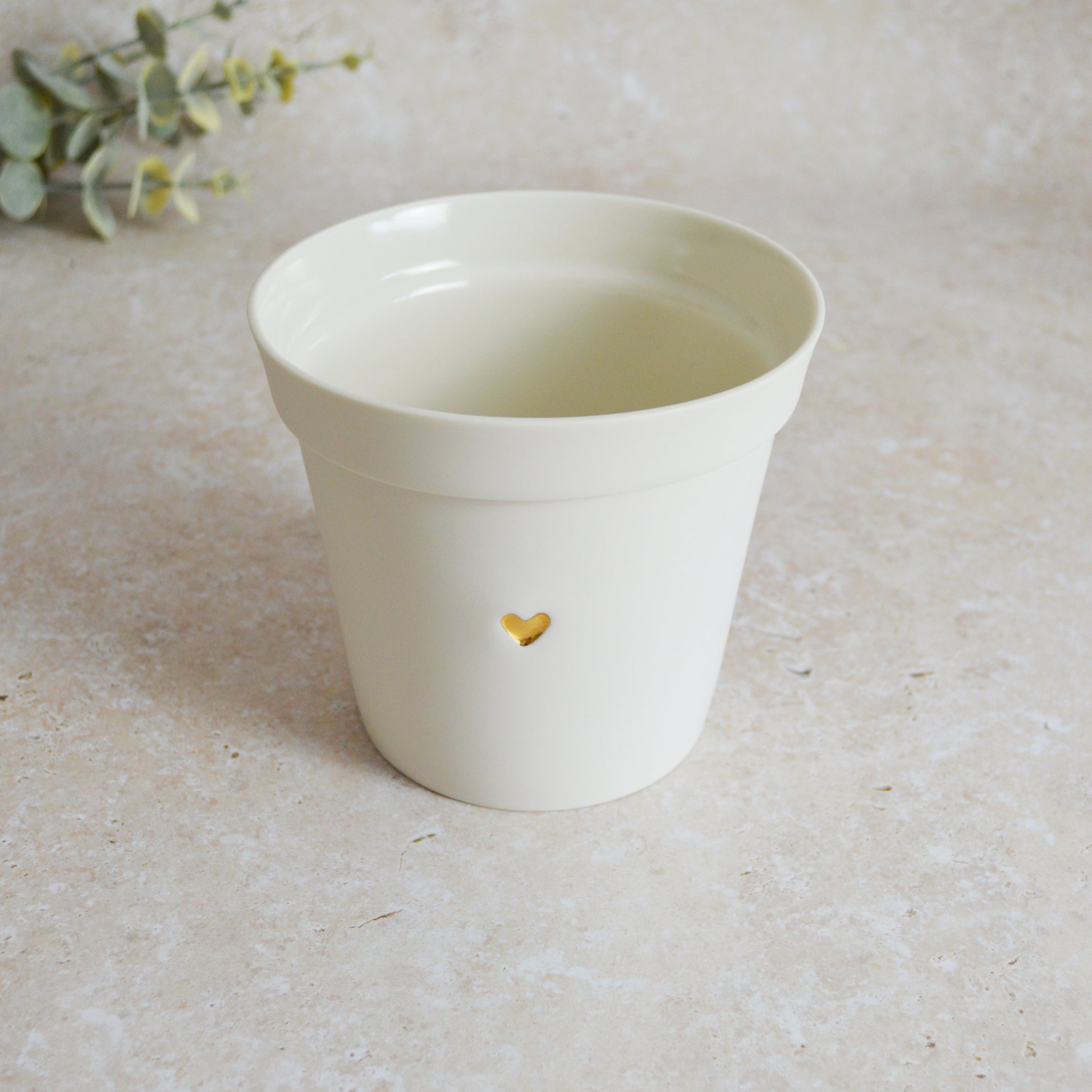 This flower pot is made from porcelain and embossed with our very own heart stamp. The heart is hand painted in gold lustre. Once the pot has gone through it's 9 stages of making, it is then hand polished for a smooth matte feel. It is finished matte on the outside and clear glazed on the inside making the pot water resistant on the inside. This pot does NOT have drainage holes.