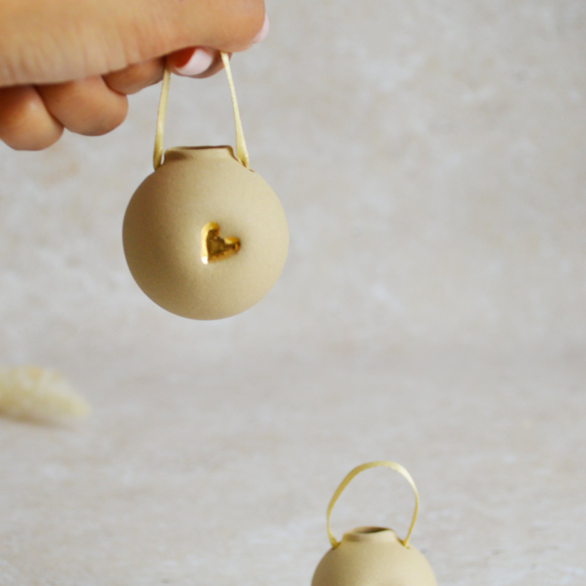 From casting, to cleaning up, to hand polishing and adding ribbon, every step of making is handled with the utmost love and care. Every bauble is embossed with our very own handmade stamp which is then carefully hand painted with gold lustre. After going through all making stages, it's finally ready to be hand polished for a smooth, matte, silky finish. Gold ribbon is then added for hanging.