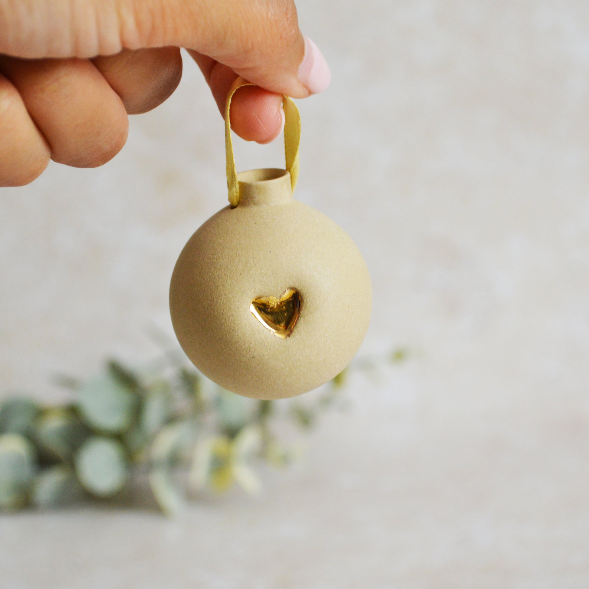 Seconds* BROWN Small Pastel Bauble With A Gold Heart | Stoneware | Hanging Christmas Decorations | Christmas Tree Decor (B34)