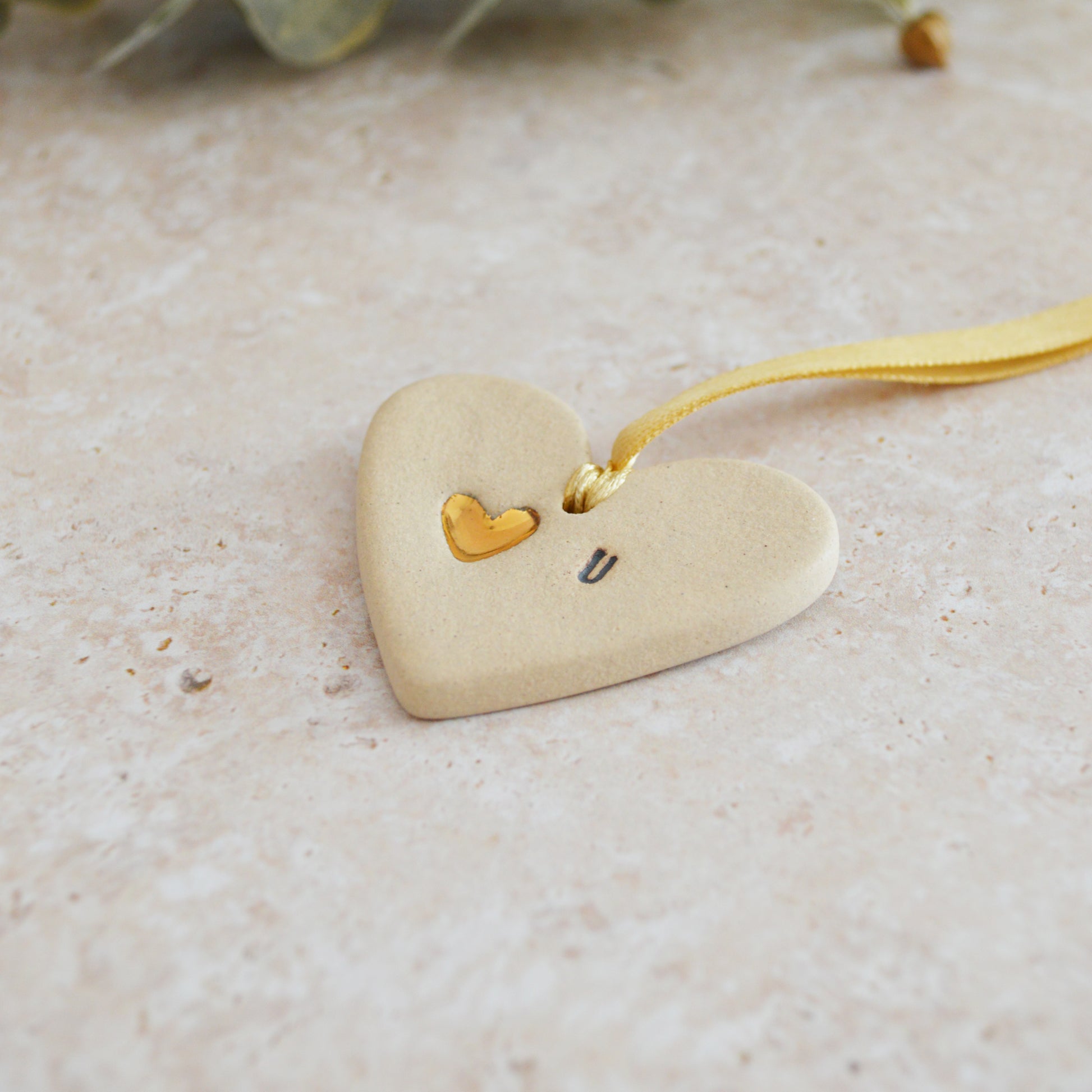 Lovingly handmade each heart has gone through at least nine stages before being packed up and sent to it's new home. The small gold heart U tag is embossed with a hand painted gold heart and the letter U stained. Once it's gone through all of it's previous stages it is then hand polished for a soft matte finish.