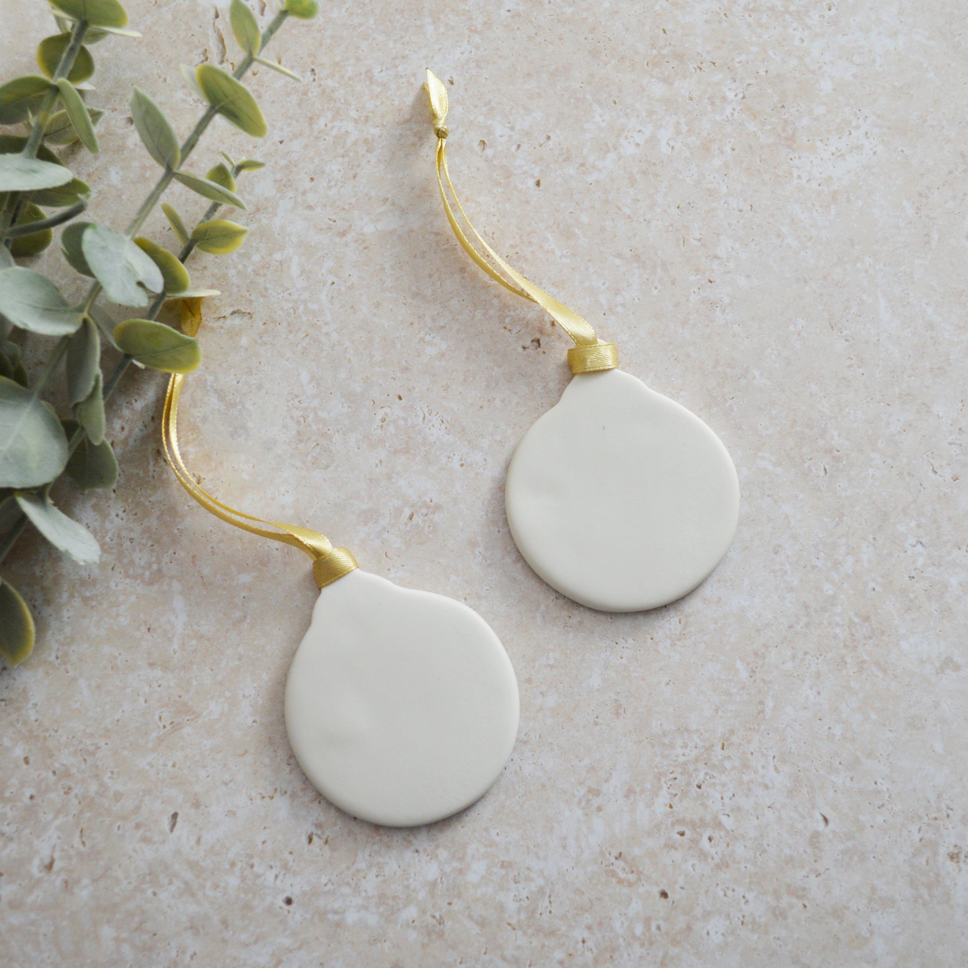 MARKED DOWN DUE TO: the overall quality of the clay. One bauble tag is slightly misshapen and the other has a small pin hole on the side.