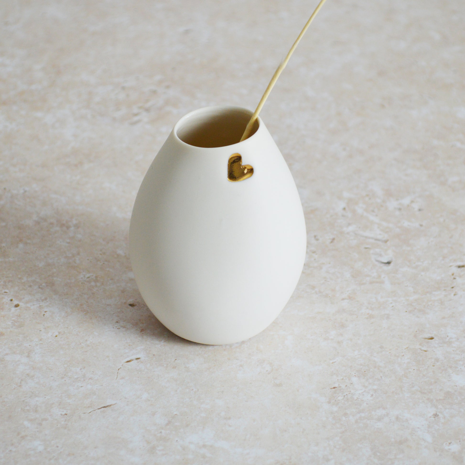 Made from porcelain, this vase is intended for a small collection of short stem flowers. Every vase is individually hand crafted and hand stamped with our own handmade heart, which is then carefully hand painted with gold lustre. After having gone through at least eight stages, it's then ready for the final stage which is going through it's second round of hand polishing. This gives the vase a smooth, silky matte finish. Clear glazed on the inside to hold water.