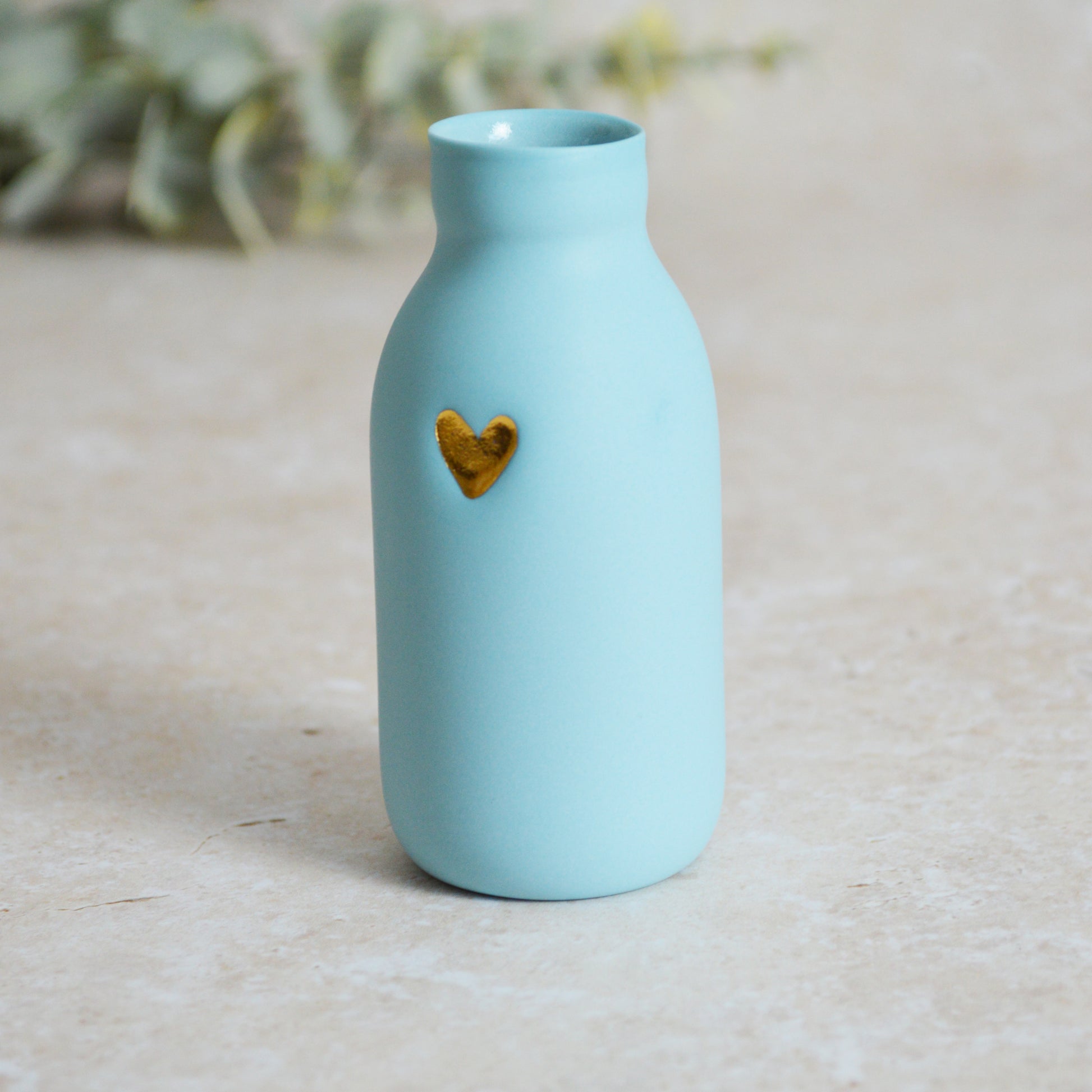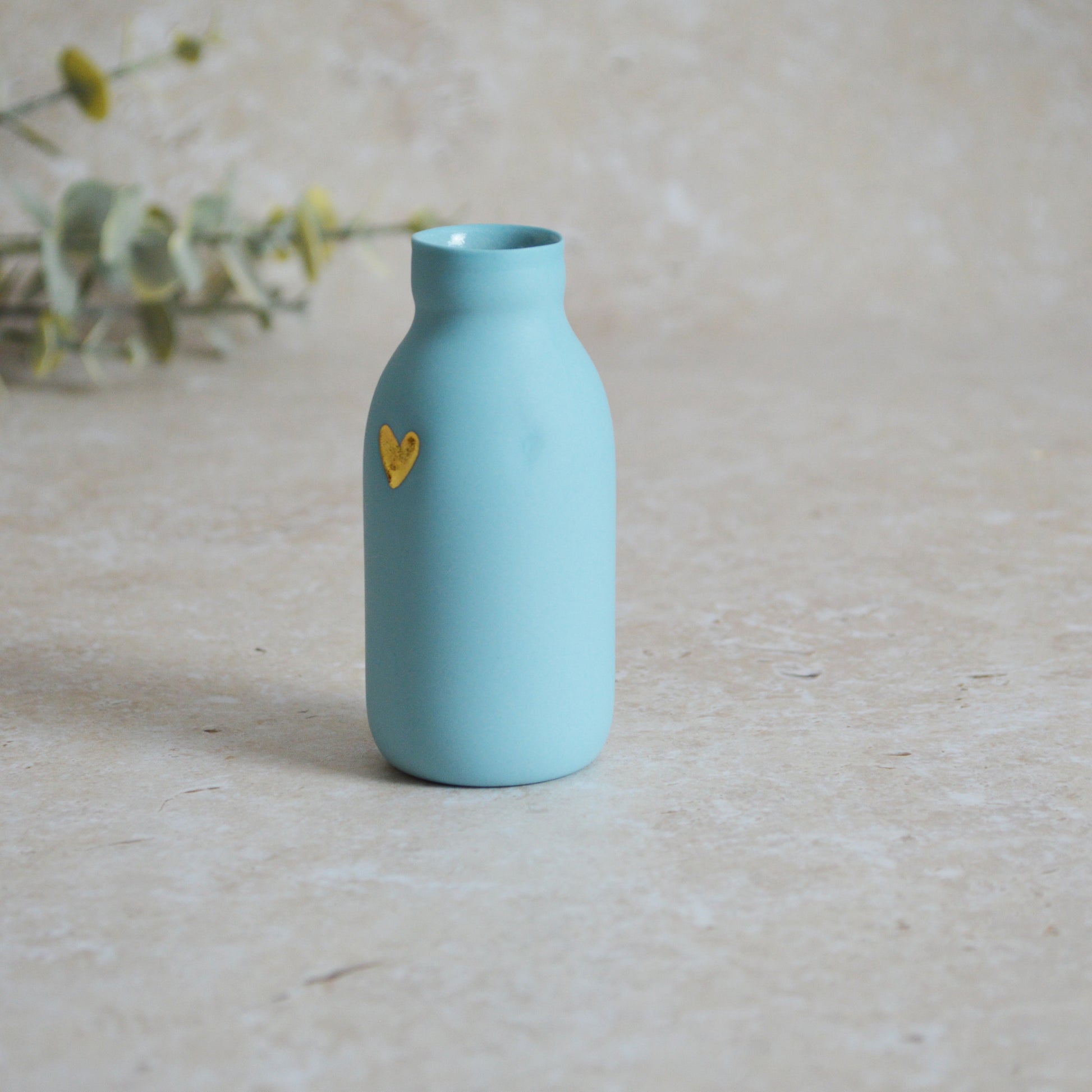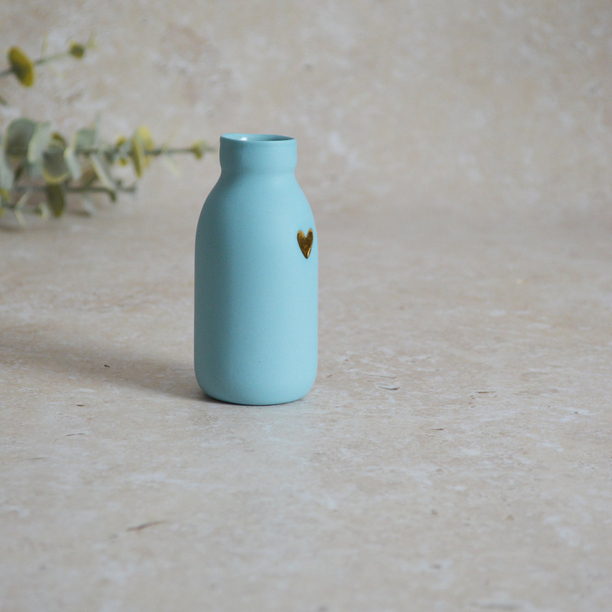 Seconds* MEDIUM BLUE Pastel Bottle Vases With A Gold Embossed Heart | Summer Vase | Flower Vase | Porcelain (A71)