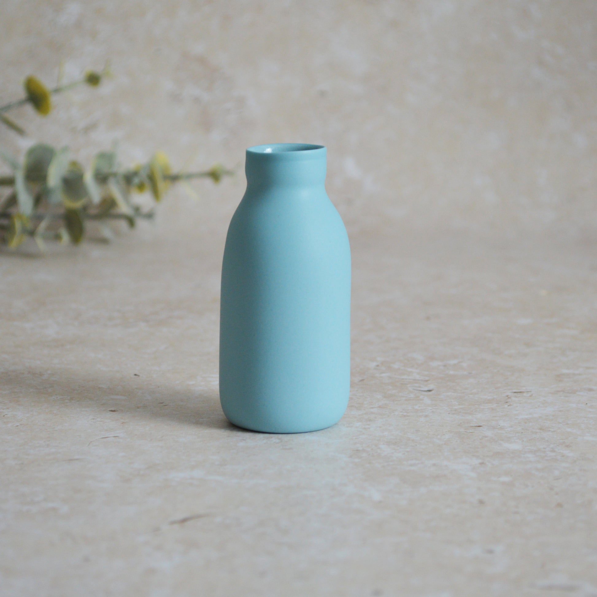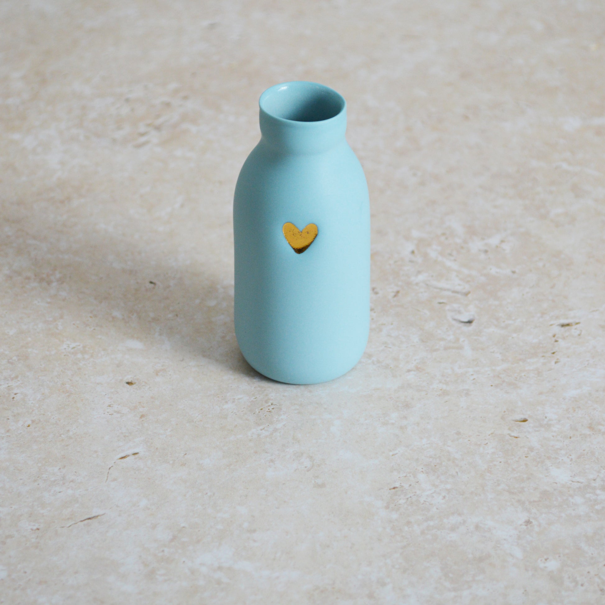 Every bottle is handcrafted from stained porcelain. Carefully made, each bottle goes through a minimum of nine stages. From casting to fettling, to hand painting the gold heart, each stage just as important as the last. Once it's reached it's penultimate stage, it's then carefully hand polished, for the second time, for a smooth, matte, silky feel. Every bottle is glazed on the inside so it can hold water for fresh flowers.
