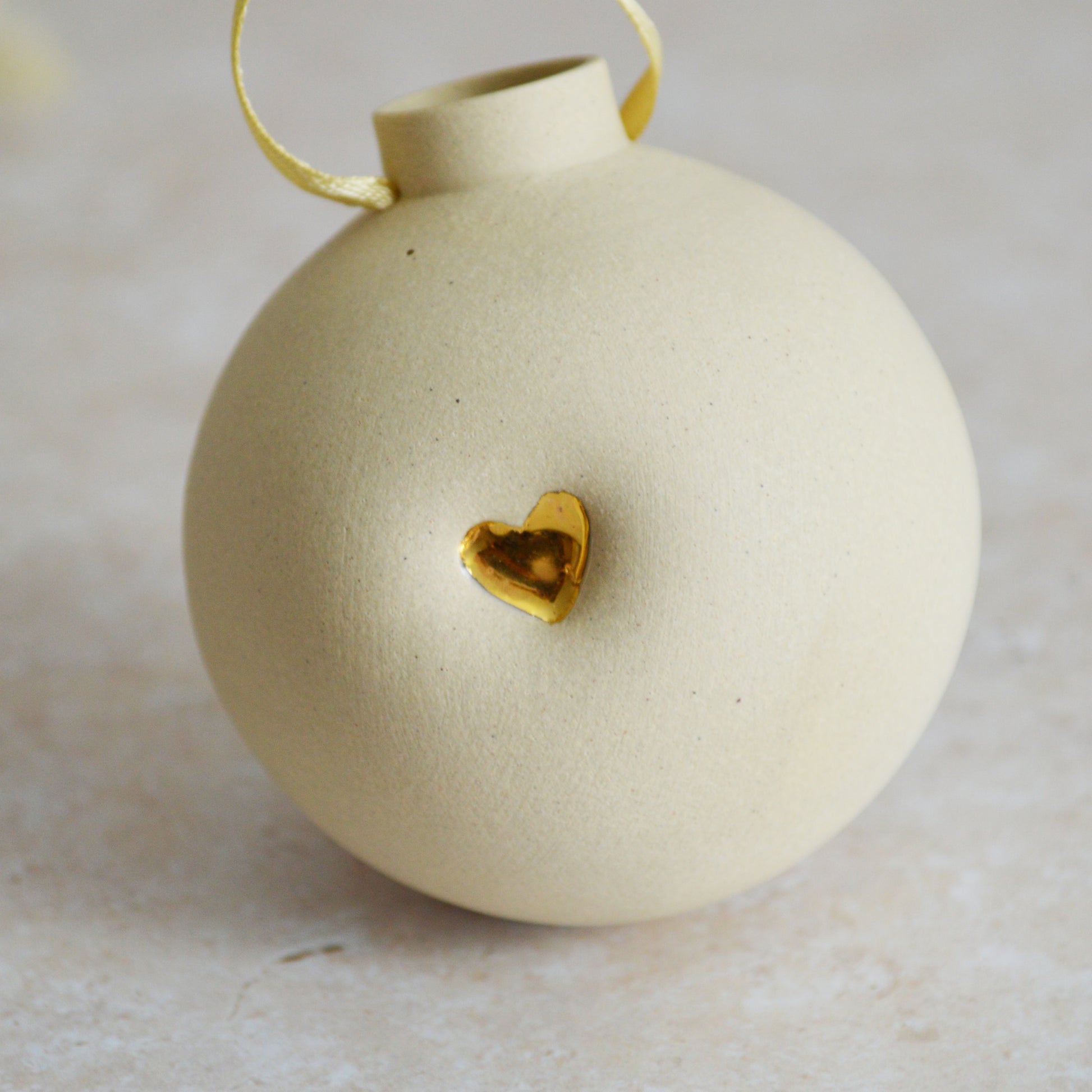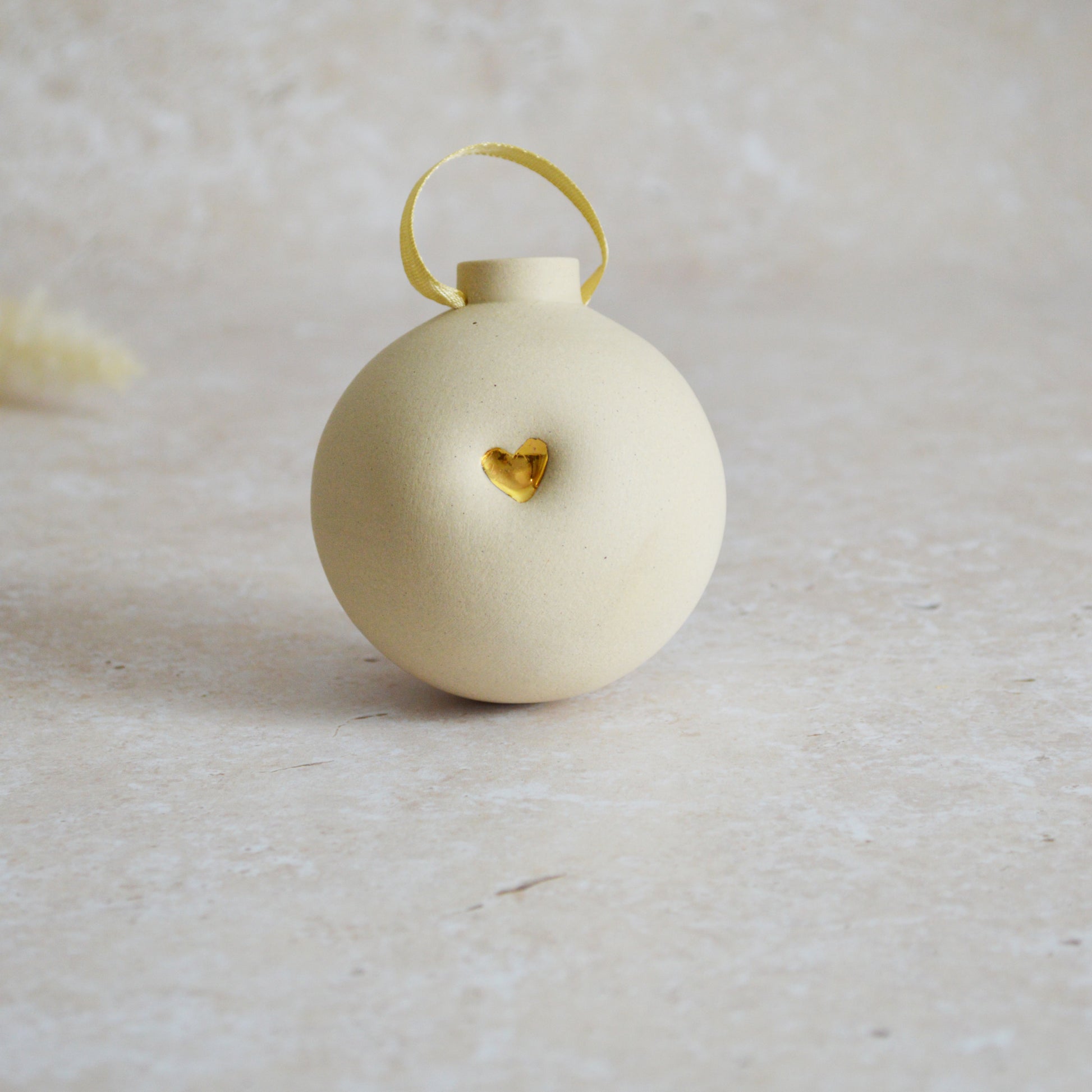 Seconds* BEIGE Large Pastel Bauble With A Gold Heart | Stoneware | Hanging Christmas Decorations | Christmas Tree Decor (B33)