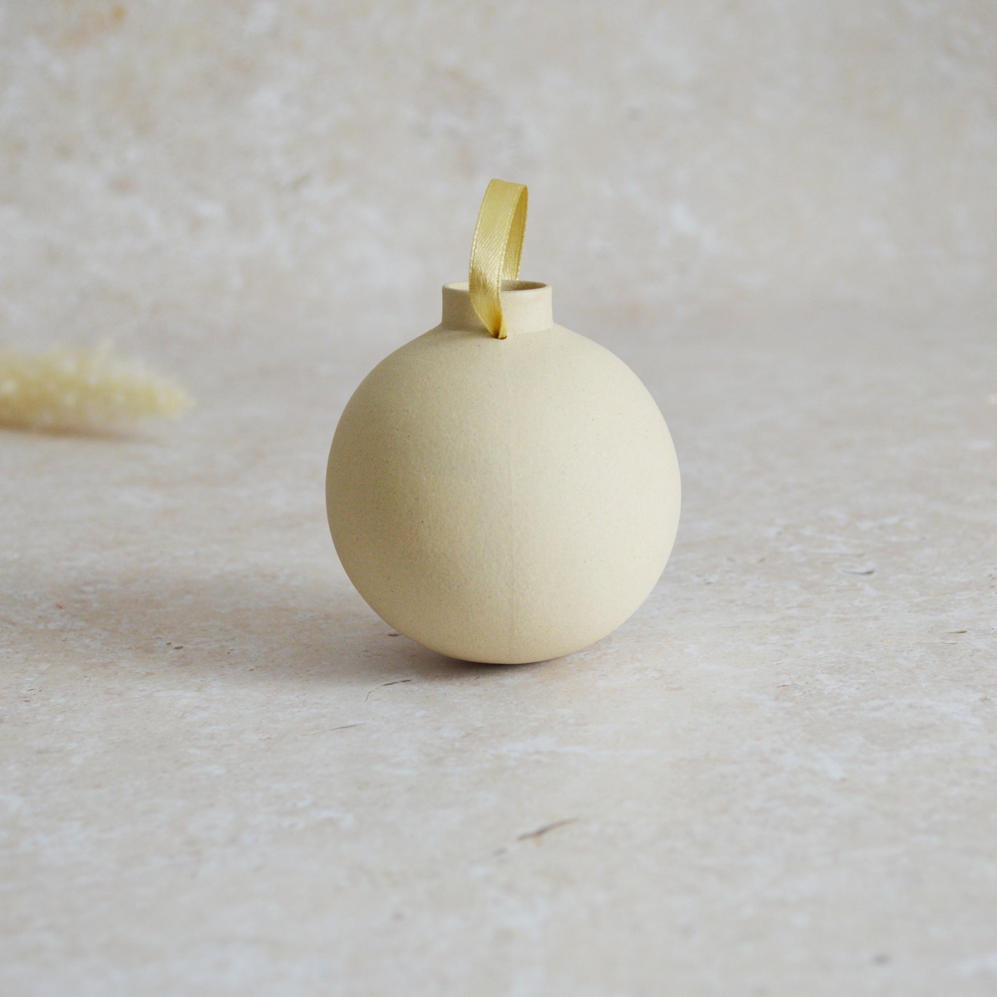 Please keep in mind, although the item is hollow, it is ceramic, and will therefore have some weight to it. Baubles which are placed on the tree may need extra support. The top opening is open to allow heat to escape during the firing process and to also allow threading of the ribbon.