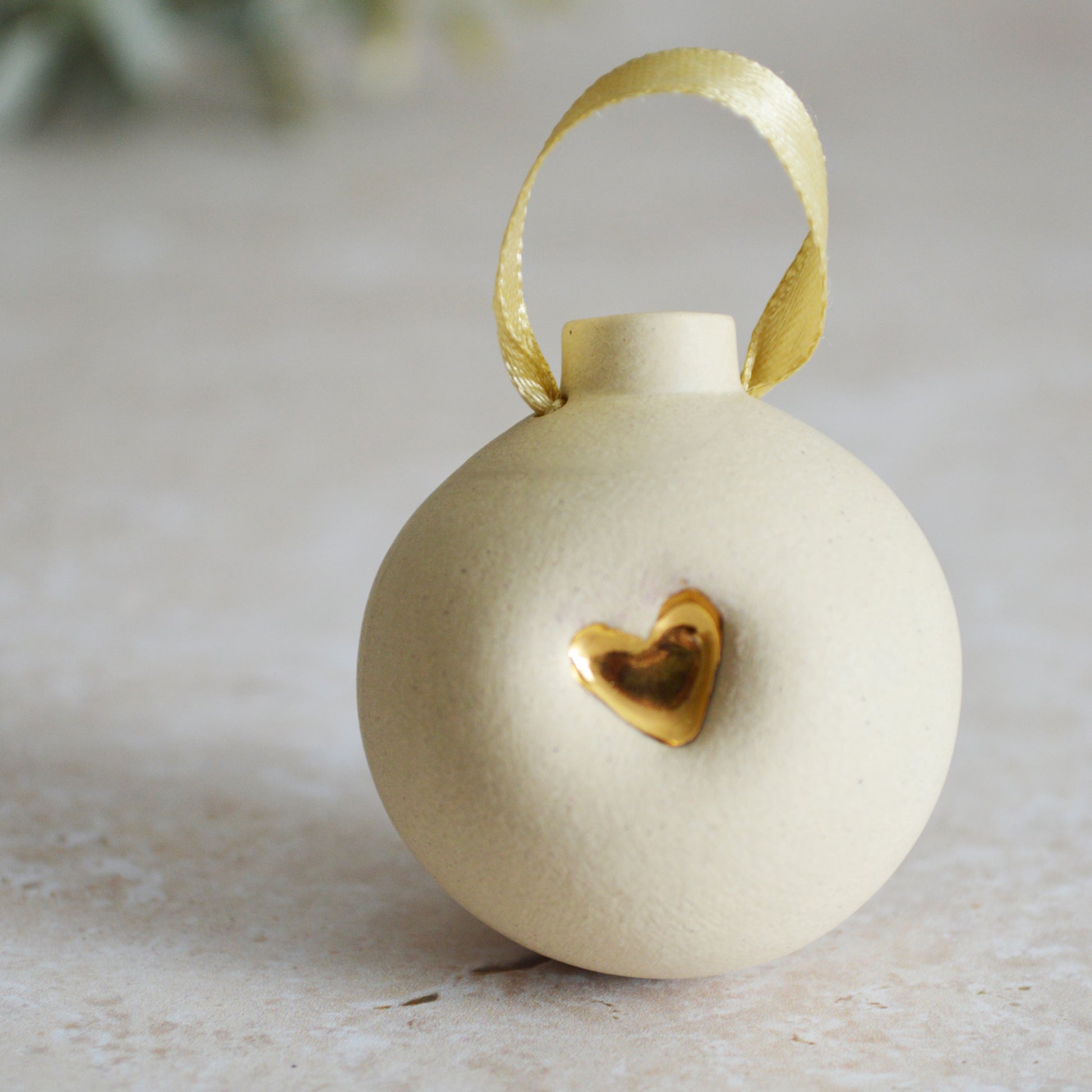 Seconds* BEIGE Small Pastel Bauble With A Gold Heart | Stoneware | Hanging Christmas Decorations | Christmas Tree Decor (B36)