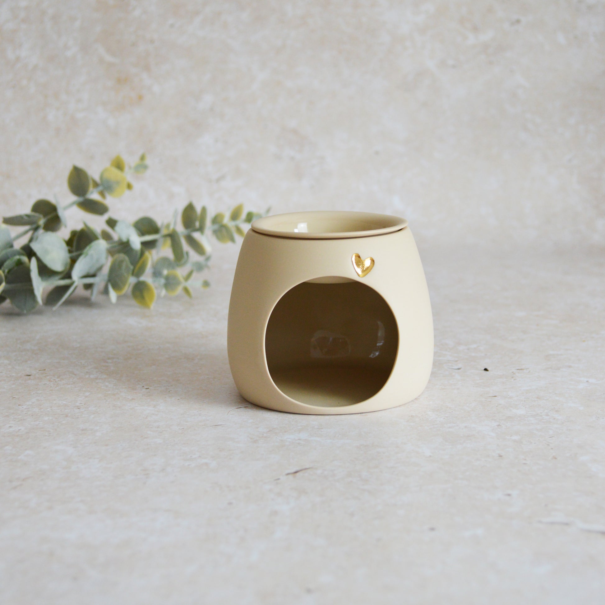 Seconds* Pastel BEIGE Wax And Oil Burner With A Gold Embossed Heart And Detachable Lid | Wax Burner | Porcelain (A49)