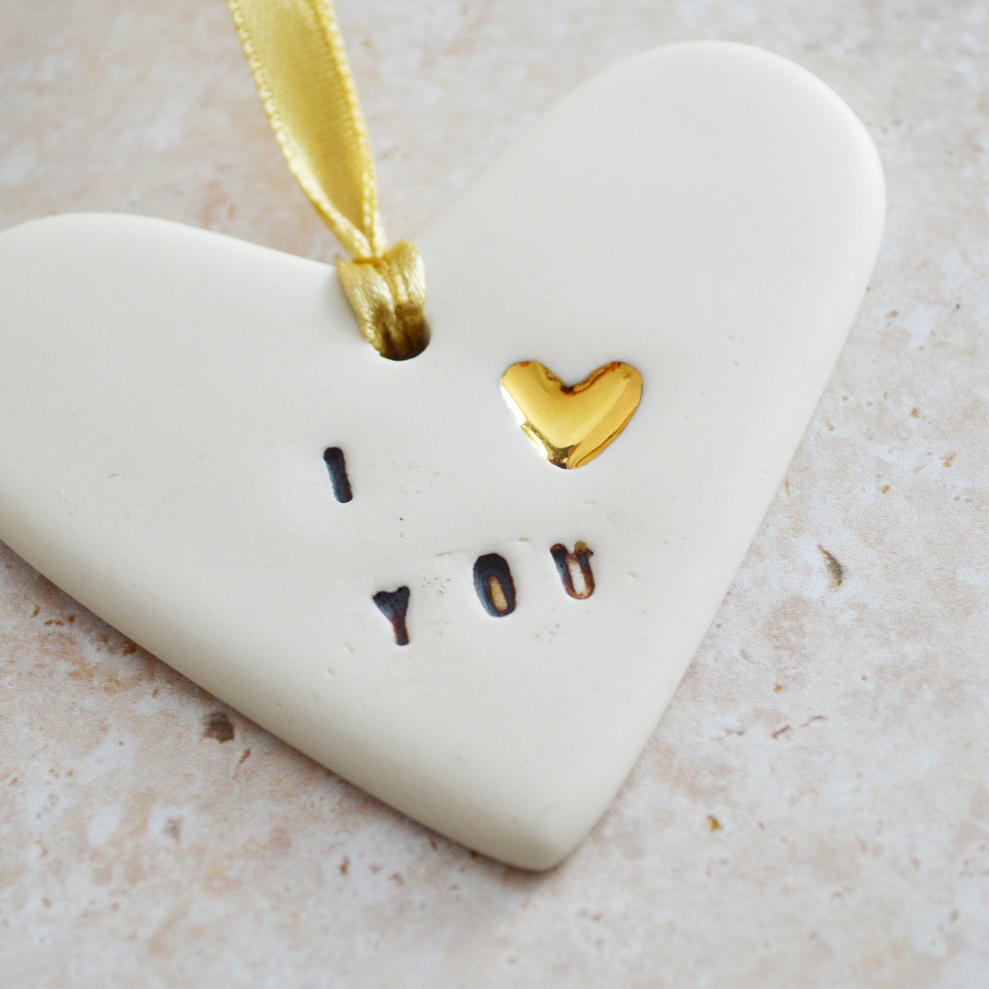 From rolling out porcelain, to cutting, cleaning up and polishing, every step of making is handled with the utmost love and care. Every letter is individually stamped and the embossed heart is hand painted with gold lustre. The letters are carefully filled with stain before being cleaned up and ready for the next stage. After going through 11 stages, it's finally ready to be hand polished for a smooth, matte, silky finish. Gold ribbon is then added and sealed for hanging.