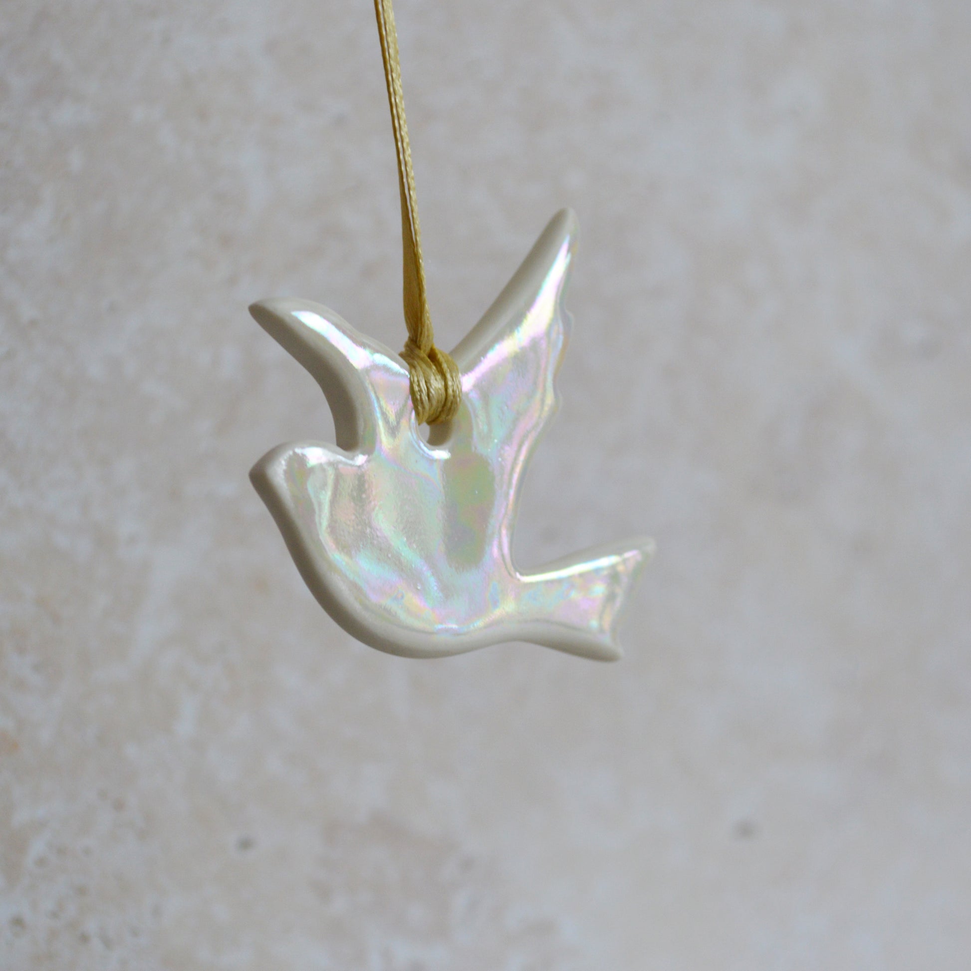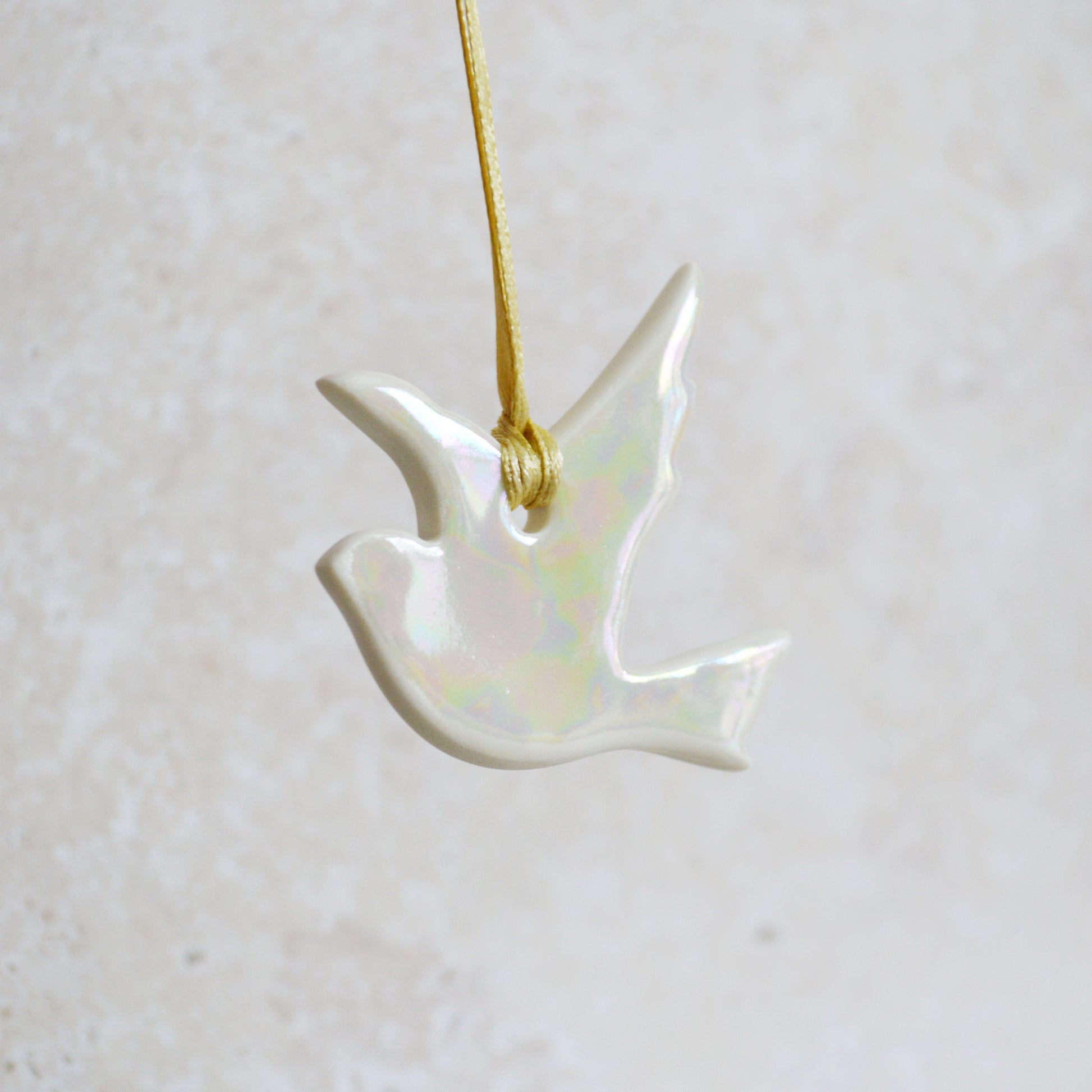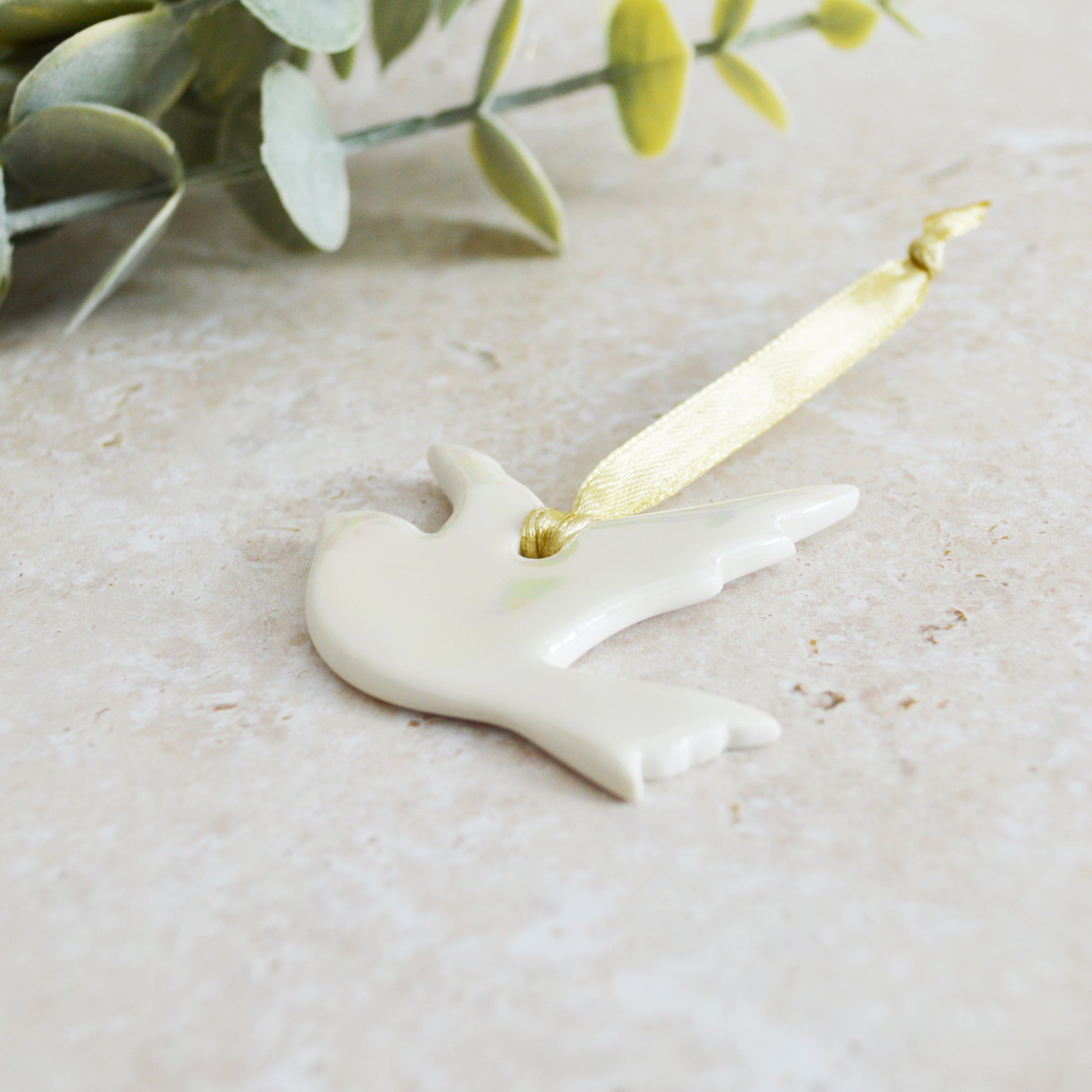 Handmade from porcelain, this little tag and has gone through at least 9 stages before being packed and sent off to it's new home. Each dove is cut, dried and every edge, no matter how small, is carefully wiped down for a clean crisp finish. It's hand painted with lustre which once fired, leaves a subtle pearl finish which shimmers when the light hits it at certain angles. The back of the tag is white. Once the dove has reached it's final step, it's hand polished for a smooth matte finish and gold ribbon is attached and sealed ready for hanging.