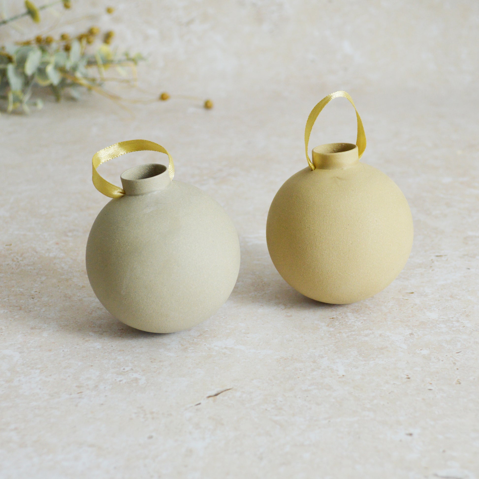 Please keep in mind, although the item is hollow, it is ceramic, and will therefore have some weight to it. Baubles which are placed on the tree may need extra support. The top opening is open to allow heat to escape during the firing process and to also allow threading of the ribbon.